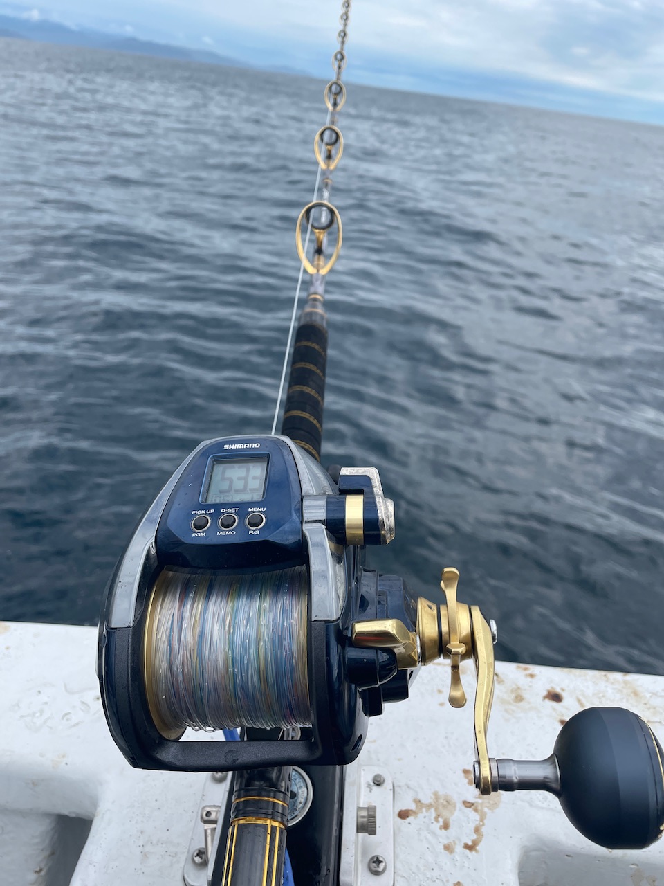 LINEはPE8号にフロロ30号を100mを巻き、チモト補強をしたマグロフックに冷凍イワシをエサに使います