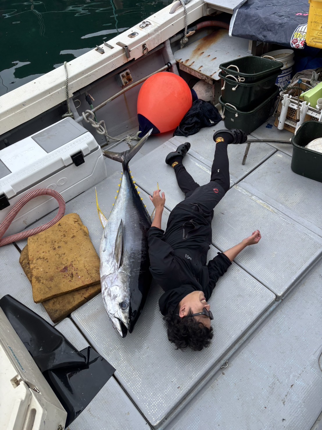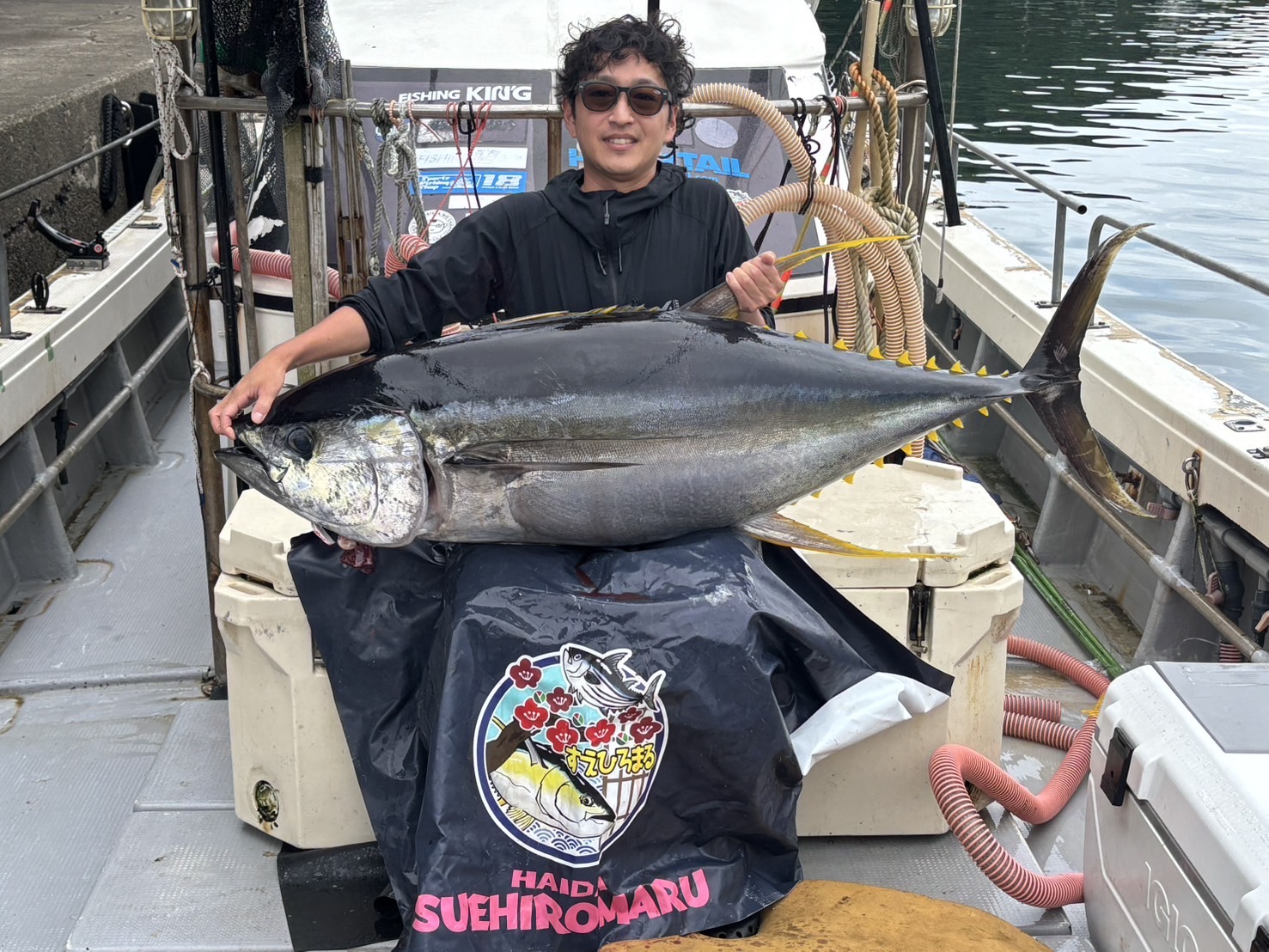 魚探に反応が出たタイミングでヒット!焦りすぎてレバーをフルで戻したりアワセが弱かったりしましたがなんとかフッキング。同行したメンバーと協力して30分程のファイトで上がってきたのはエラワタ抜き52.8kgのキハダマグロでした!