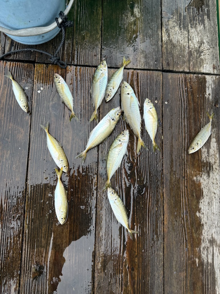 サビキ釣りでは サバ、アジはいくらでも釣れます。他にモジャコ(ブリの幼魚)が釣れて7目達成でした。