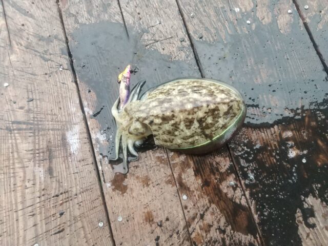その後、回遊がまばらになってきたためヤエンにチェンジ。何度かチャンスはありますが、乗らなかったり糸が切れてしまったりと残念ながらキャッチはできず。同行者2人はエギングでチャンスをものにし、胴長20cmを頭にアオリイカを3杯、コウイカを3杯キャッチしていました。