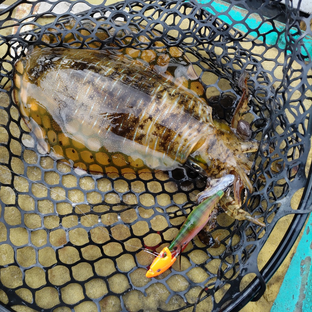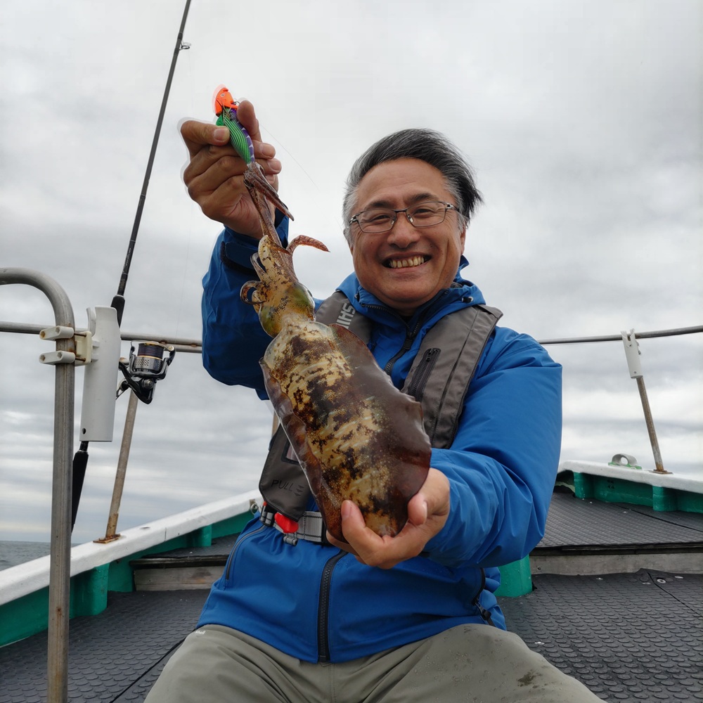 その後はティップにアタリがあっても乗り切らず苦戦します。船内で釣れた情報と船長からのアドバイスをミックスしながらエギを赤テープに切り替えて3バイ追加することが出来ました。この日はボトム付近でエギを止める事とアタリがあっても少し我慢して待つことがヒットするコツでした。ウネリがある時にミヨシ側で釣る時はロッドの長さがある方がアタリが見やすいのと合わせがしっかり決まるのが良かったようです。あとドラグは締め気味にしてシャクった時にチチッと鳴るぐらいにセットしていますよ。