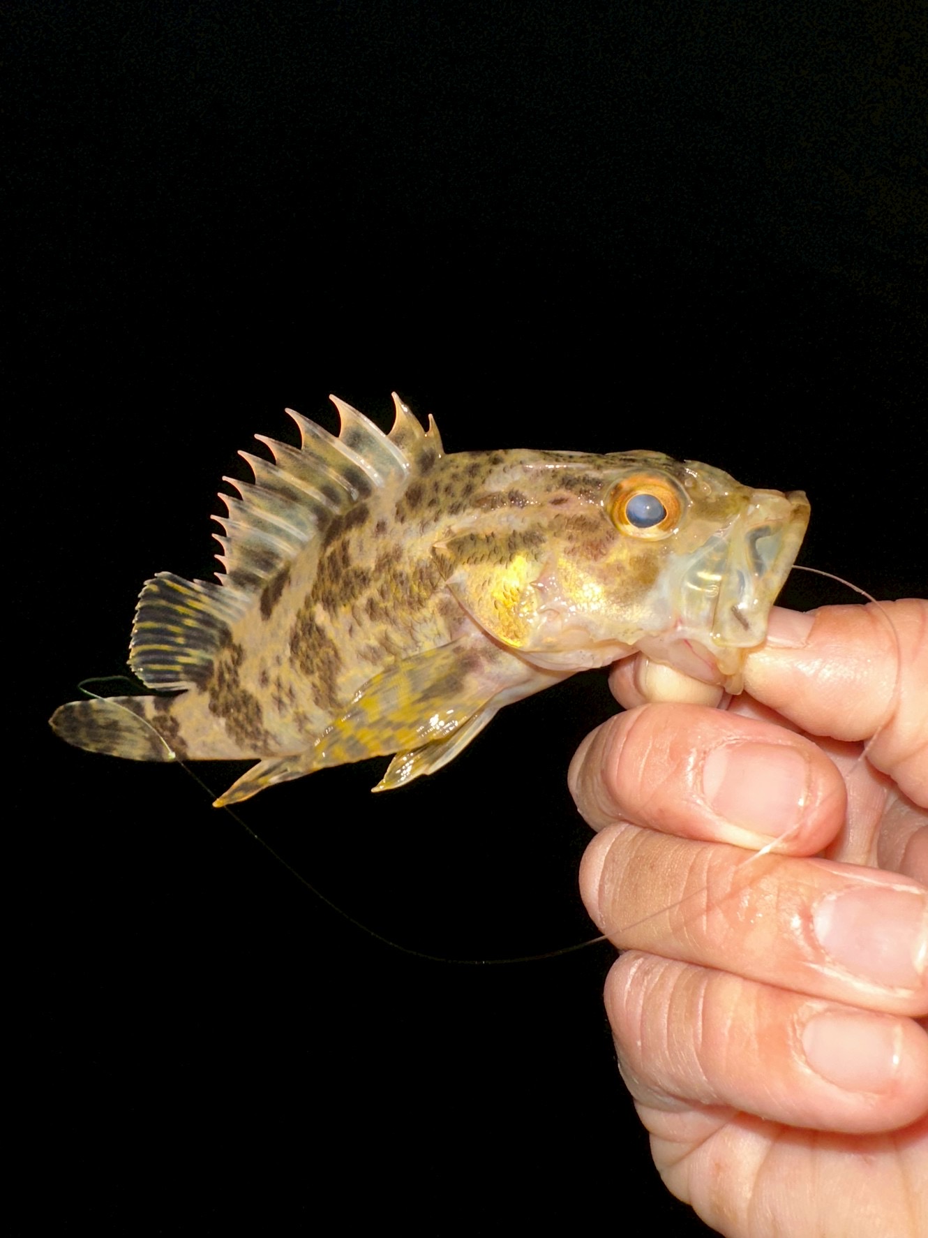 常夜灯の下には、セイゴと小メバル、新子アオリも見えましたがアジの姿がなかなか見つからず、潮が動き出したタイミングで良いアタリがあり、本命のアジをゲット。単発の為移動。明け方も近くなり下潮が流れると連発もありましたが明るくなるとアタリが止まってしまいました。アジ以外にもセイゴ、メバル、タケノコメバルも釣れましたよ。