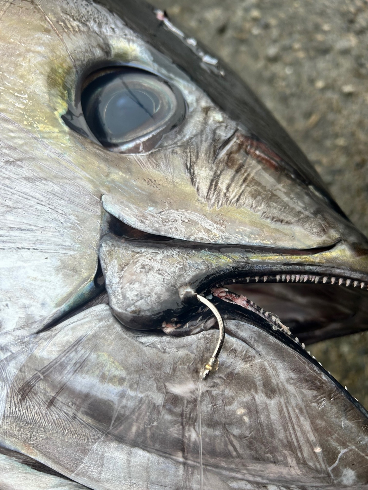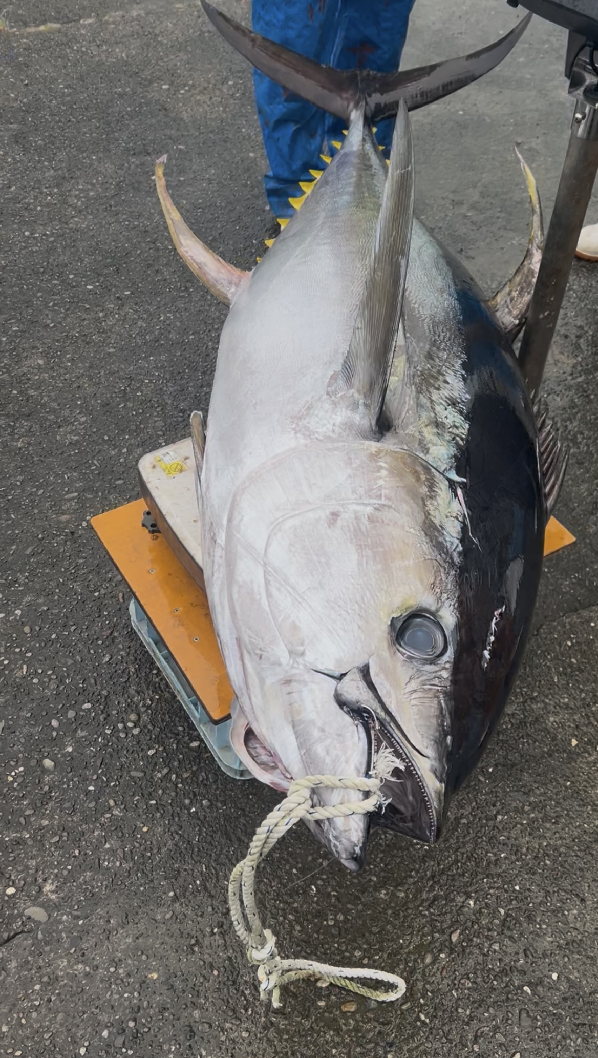 5連休の釣るまで帰らん企画2日目。この日は前日復調を見せた潮岬沖へ。前日同様、ソナー、魚探にはキハダの反応はあるものの、なかなか食わすことができず、船中ヒット無しの時間が流れる…。後方の方に待望のヒット!全員がサメだと思ったその魚は、なんと75.1kgの綺麗なクシモンでした!その後、ソナー、魚探に反応がない時間帯もあり、広範囲を探るべく、糸を出す。110m…120m…130mでヒット!これはかなりデカい!ドラグをFULLのすぐ手前まで上げるがそれでも糸が出ていく。仕方なくFULLまでドラグを入れる…ここで痛恨のラインブレイク。針の少し上で切れていたのでサメのはずです。隣の方も130mでヒット!同じくデカい!電動で時間を掛けて上がってきたのはでっかいサメ。これっきりアタリは無くなり終了。翌日、翌々日は時化のため休船となり、泣く泣く帰りました。気分を新たに仕切り直します。
