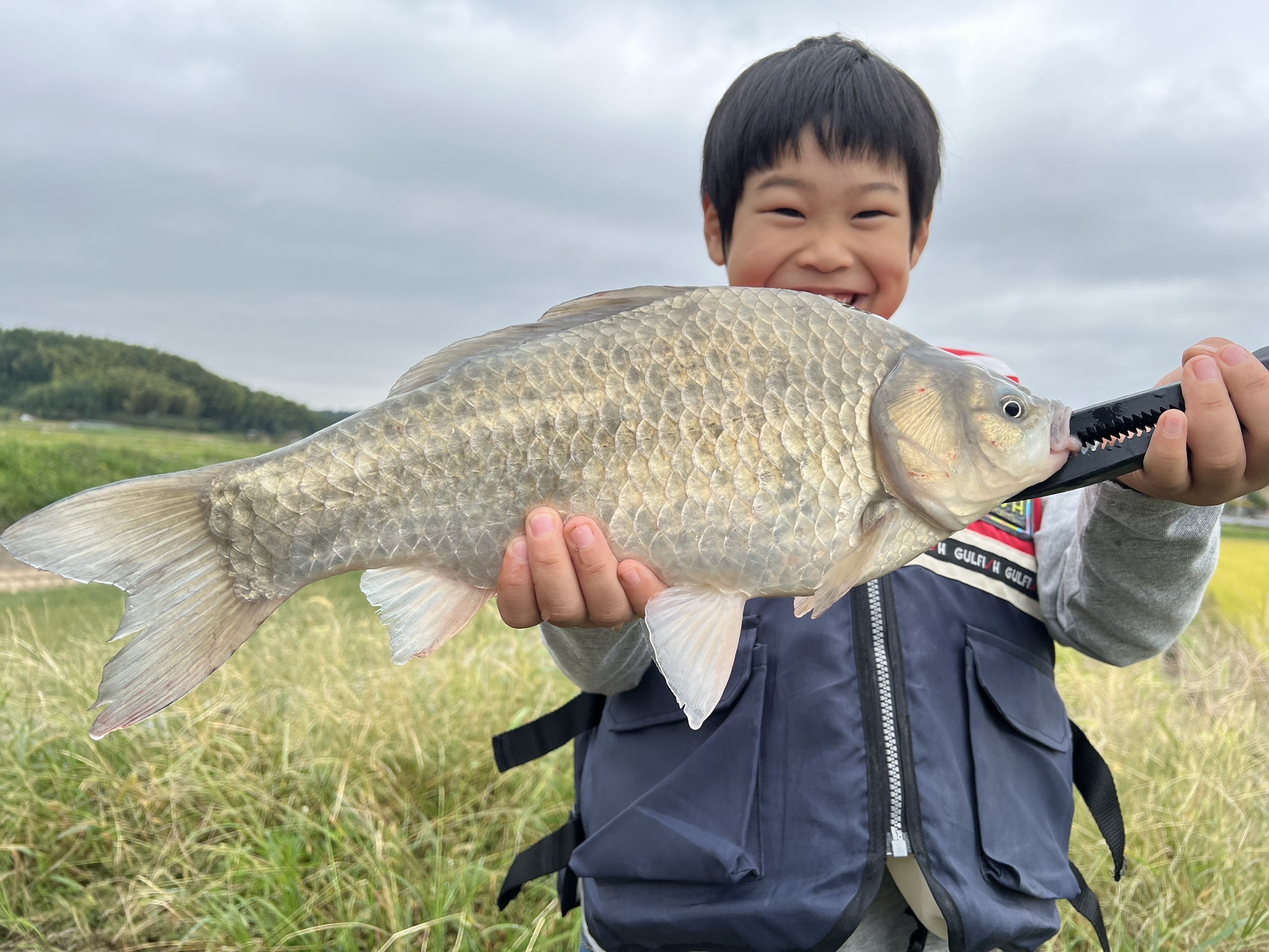 前回はカメとブラックバスとブルーギルだらけでしたが、今回はアタリが少なめ。ミミズエサのウキ釣りで粘ります。すでに三男は虫取りモード。次男はカメが釣れてカメモード。するとしっかり釣りしてた長男が魚がヒット!お父さんタモいる!と叫んでます。近づくとデカいフナ!しっかりタモ入れして釣りあげました。