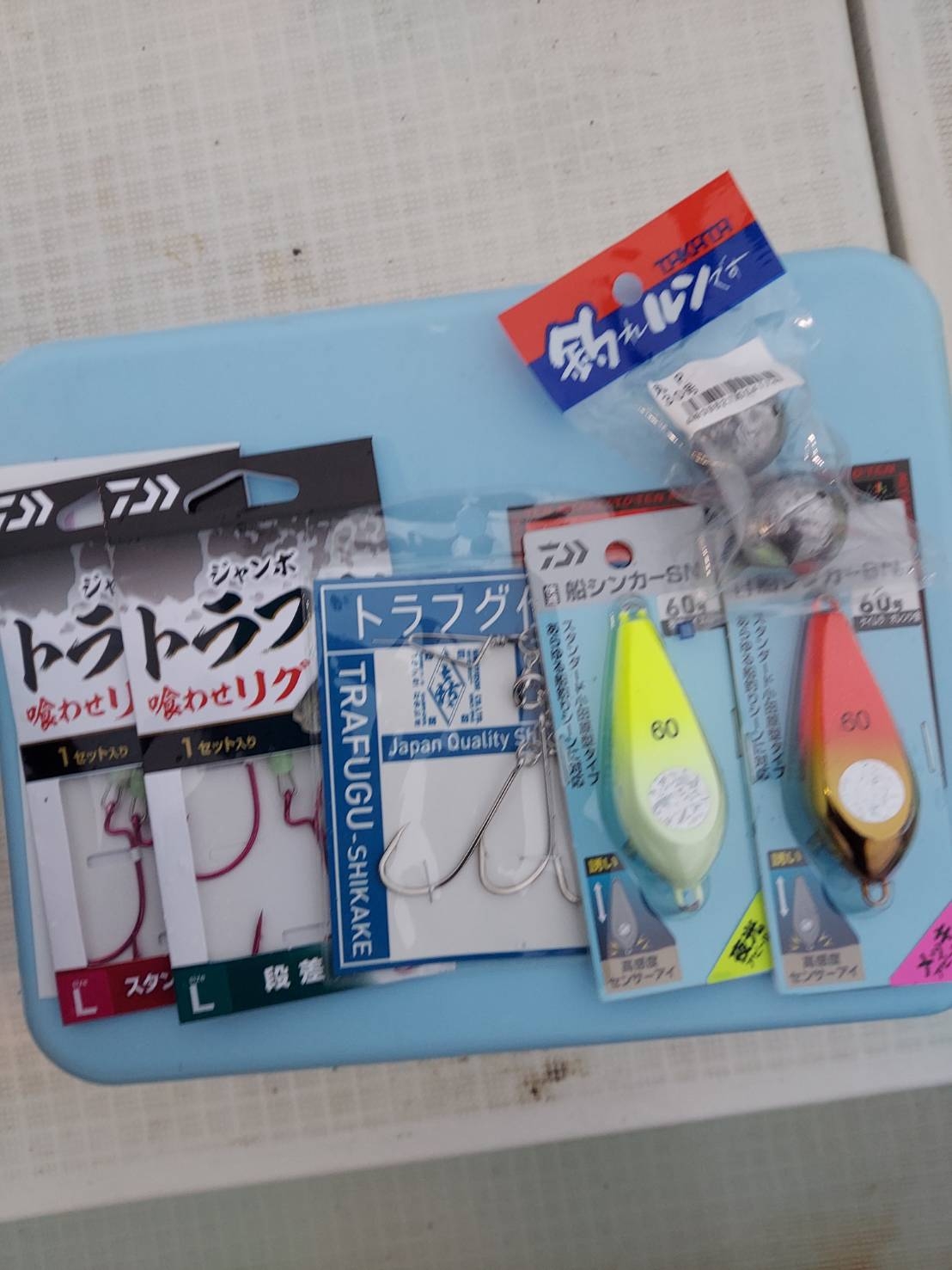 60号のオモリにトラフグ専用3本針仕掛、潮流が早くなれば丸玉オモリ30号を追加して対応します。