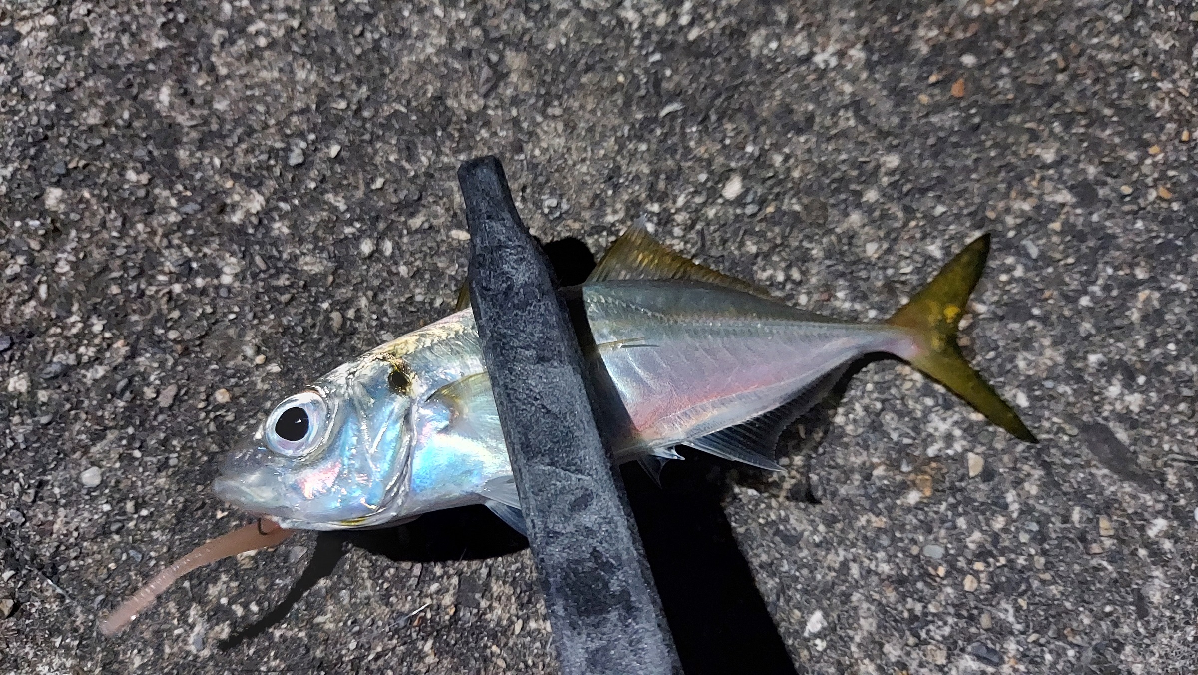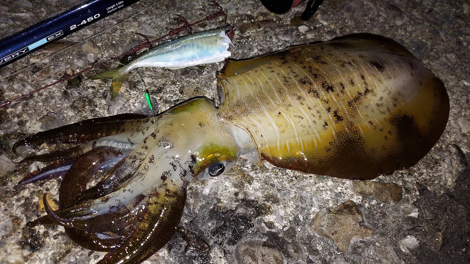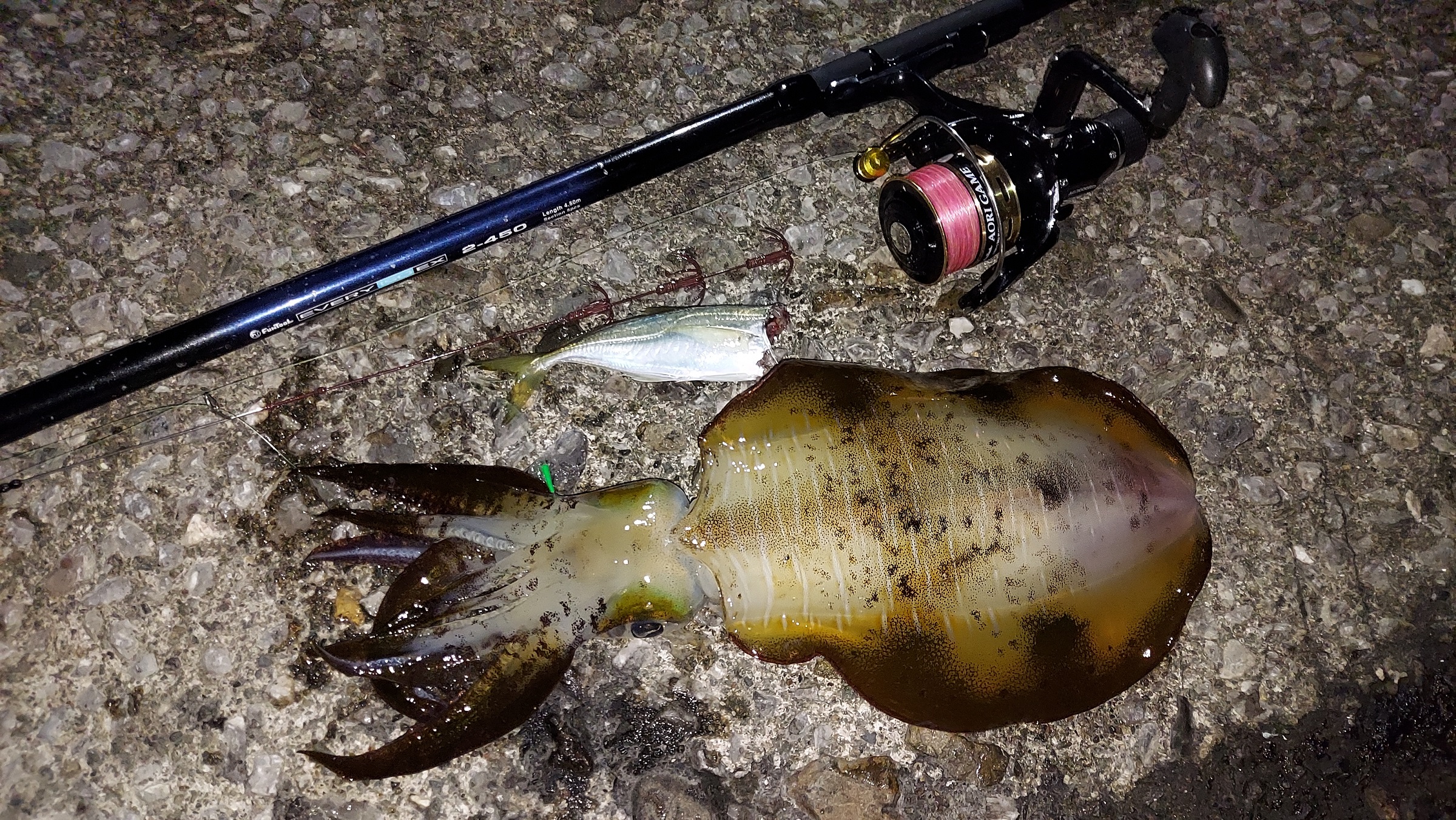 南伊勢周辺にて堤防ヤエン釣りとアジングを楽しんできました。出来ればアジングでエサを調達して、そのままヤエンのエサとして使えるのが望ましいので色々とアジングで周りながら墨跡を探してラン&ガンしました。しかし、どこに行ってもアジは釣れるものの豆アジばかりでヤエンのエサとしてはもう一回り大きさが欲しいところ。去年はこの時期だと18cm台が釣れたはずなのですが、何かおかしい・・・。ひとまず豆アジで我慢してヤエンをやってみました。暫くしてアジの動きじゃない直線的なドラグ音がきました!少しラインを巻いてヤエン投入!しかし、取り込みでミス・・・外れてしまいました。気を取り直してやっているとすぐにアオリヒット!今度は慎重に!ランディングも上手くいきました。サイズは測りませんでしたが、程よいサイズです。その後も3回ヒットしましたが全部外れてしまいました。5ヒット1キャッチ・・・。何故?と思ったらヤエンを足元に置いておいたら何回も踏んづけていたのが、カンナが全部潰れて、ラインを通すところもひしゃげていました(笑)。そりゃ掛からないわ・・・。暗くてチェックを怠った報いです。みなさんはヤエンを足元に置くのはやめましょうね!アオリは超高活性でやってみると案外簡単に掛かるかもしれません。アジングとセットだとエサは現地調達も出来ますしおすすめです。