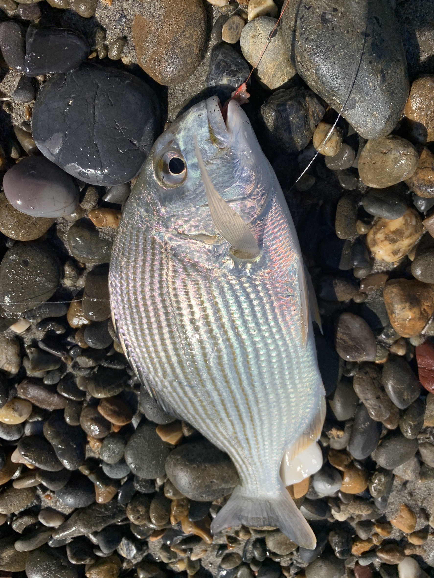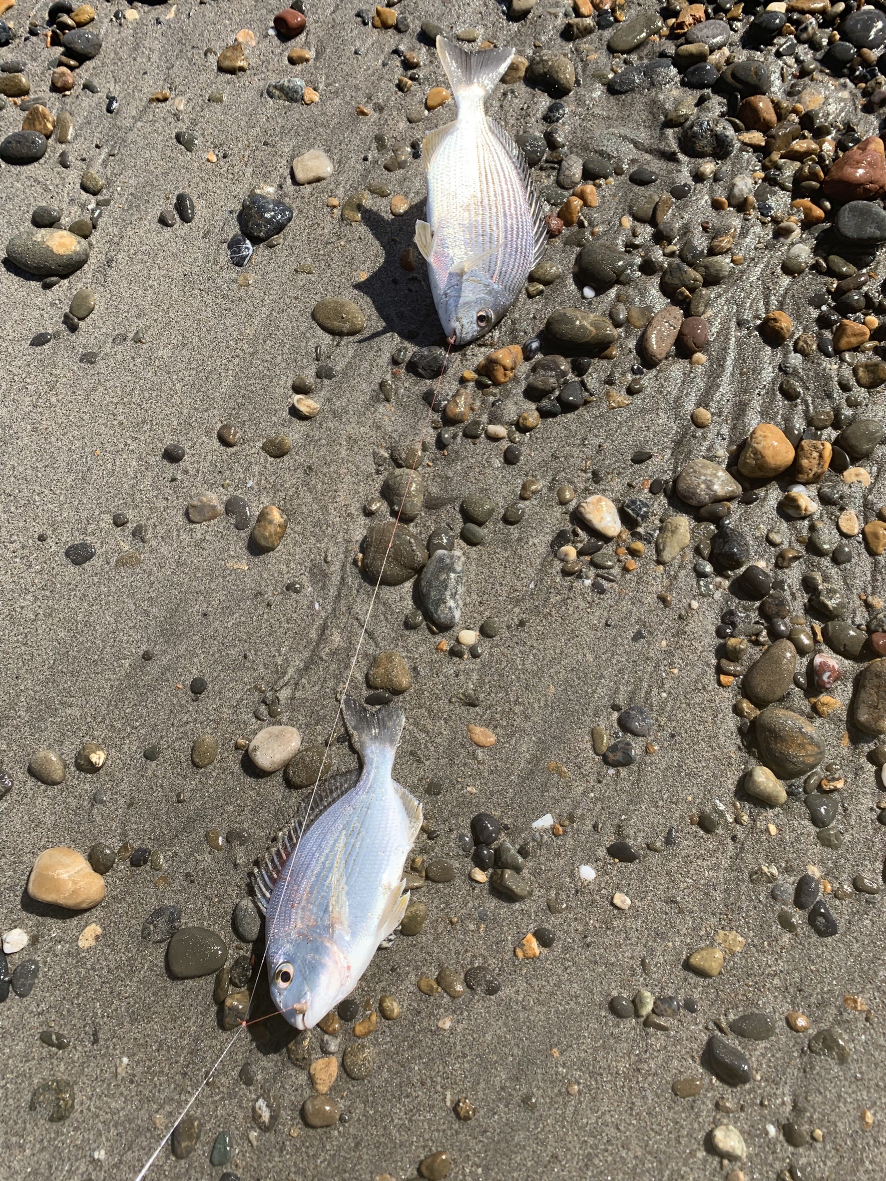 遠州サーフでチョイ投げをしました。エサはアオイソメと石ゴカイ。寝坊したのでのんびり行ったらキスの時合いは終わったとの事。仕掛けはハヤブサの3本の競技針8号を使用しました。すぐにガツガツとしたアタリが出て釣れたのは25cmくらいのヘダイ。その後も小型混じりでヘダイがアタリ続けて沢山釣れました。キスは18cmが少し混じりました。簡単に釣れるので初心者の方も楽しめます。