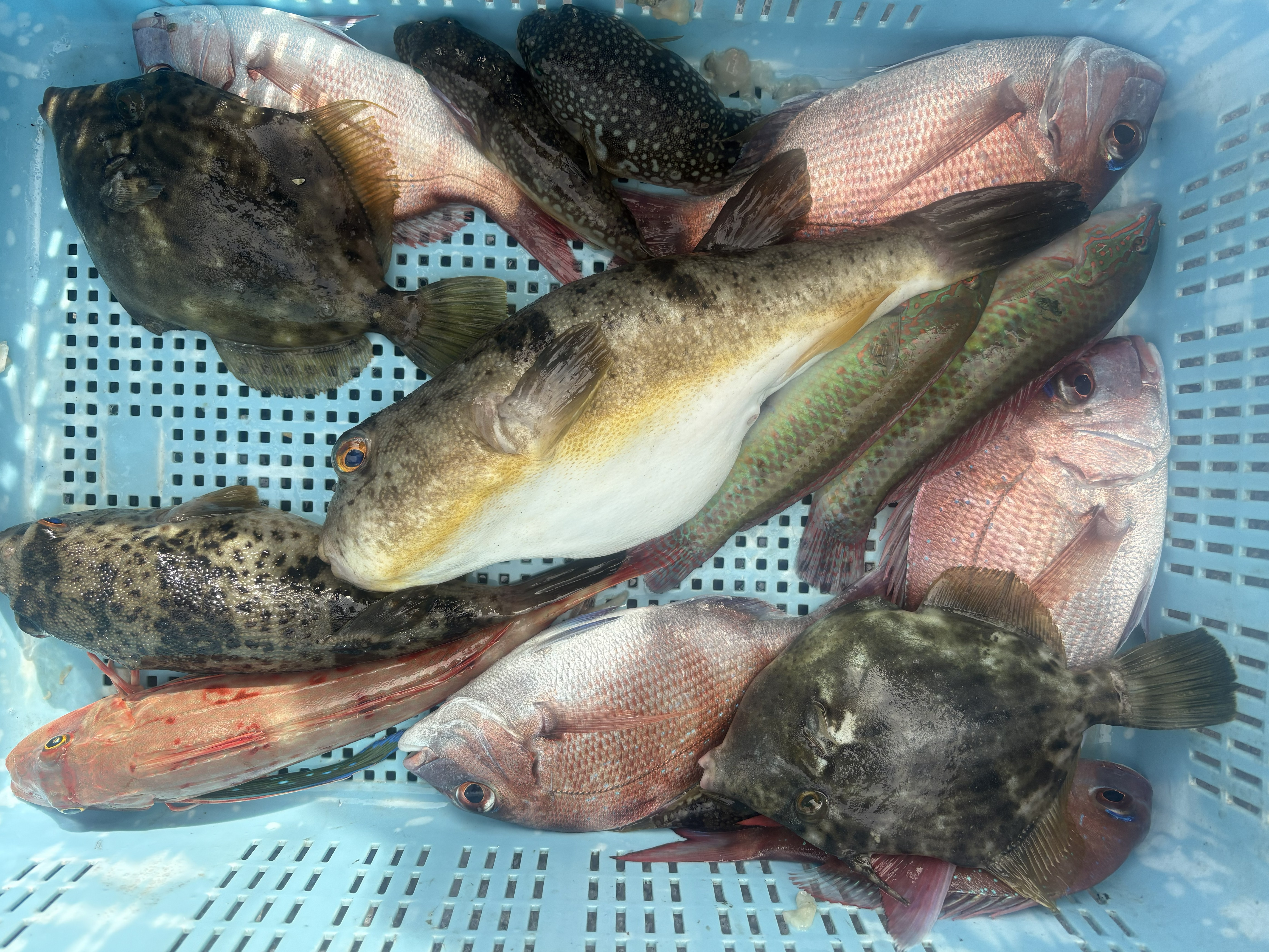 小鯛が入れ食いです。この日はカワハギ、フグ、ホウボウ、ベラ、小鯛と