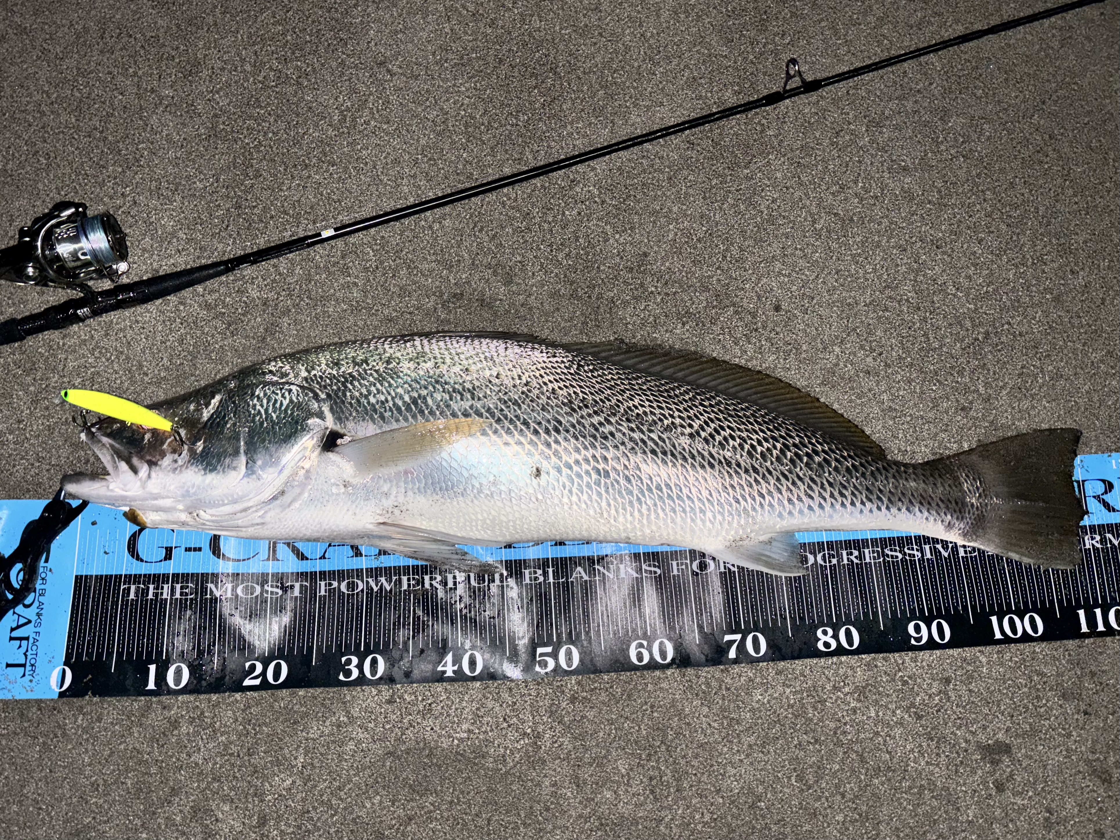 ファイト中と撮影時の魚体の重みで腕がパンパンになったので終了!夢だった遠州オオニベのメーターオーバーが釣れて感動しました!まだまだシーズンは始まったばかりなので、皆様も是非夢の遠州オオニベにチャレンジしてみて下さい!ただし、引きが半端じゃ無いのでPE1.5号以上300mと#2以上のフックは必須ですよ!