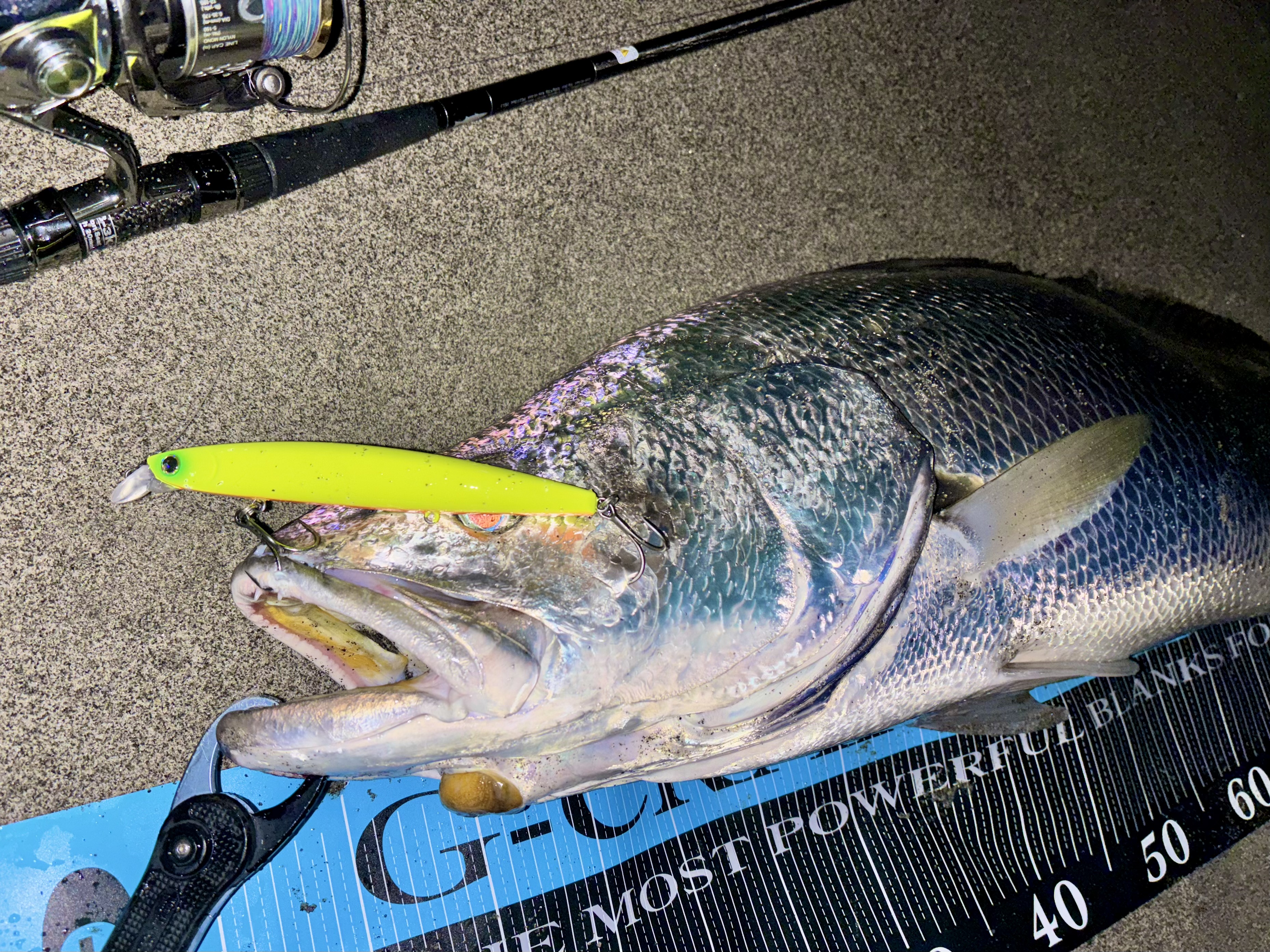 前日の大雨で波がまた高めですが、20時ごろには落ち着いて来たのでそこからしっかりランガン!目当てのポイントまで歩きましたがノーバイトで、帰りながら同じポイントを打ち直して行くことに。前回同様ロンジンのハイスタンダード150をフルキャストして、波動が出ない程度にゆっくり流しながら巻いて行きます!結局最初の所まで戻って来てしまい、今日はダメかと思っていると突然ヒット!合わせた時は軽めでしたが、本気を出し始めたのか段々と猛烈に走るようになってきました!寄せては30m程また走られを繰り返す事15分、遂に波打ち際までずり上げ完了!重すぎて上げきれなさそうだったので、必死にフィッシュグリップで確保!なんと、110センチの正真正銘のオオニベを遂にキャッチ出来ました!