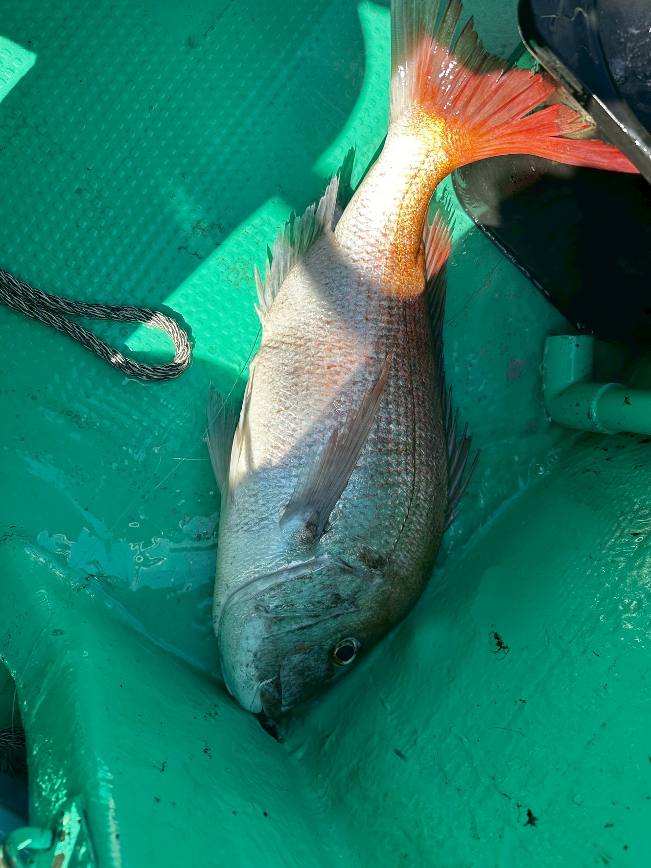 この日は最良のベイト、イワシを船長が見つけて貰い期待大!イワシが居るならと太めのハリス10号、フラッシャー付S針のまるふじの仕掛けを選択。丁寧に誘うとプルプルとイワシヒット!そのまま海底で竿先が大きく引き込まれてヒット!朝イチは美味しいキジハタゲット。さらにハマチ、ワラサもゲット!途中でベイトが散ってしまい暫く捜索。仕掛けも8号ハリスへ変更。再開してからジアイ到来!大物の予感でハリスを12号へ変更。プルプルイワシからズドン!竿は満月に曲がり強引に浮かせてヒラマサ、マダイもキャッチ!楽しすぎる!ジアイ終了まで何度となくアタリを楽しみ獲れなかったヤツもいましたがワラサ7本、ヒラマサ、キジハタ、マダイと大満足の釣行でした。