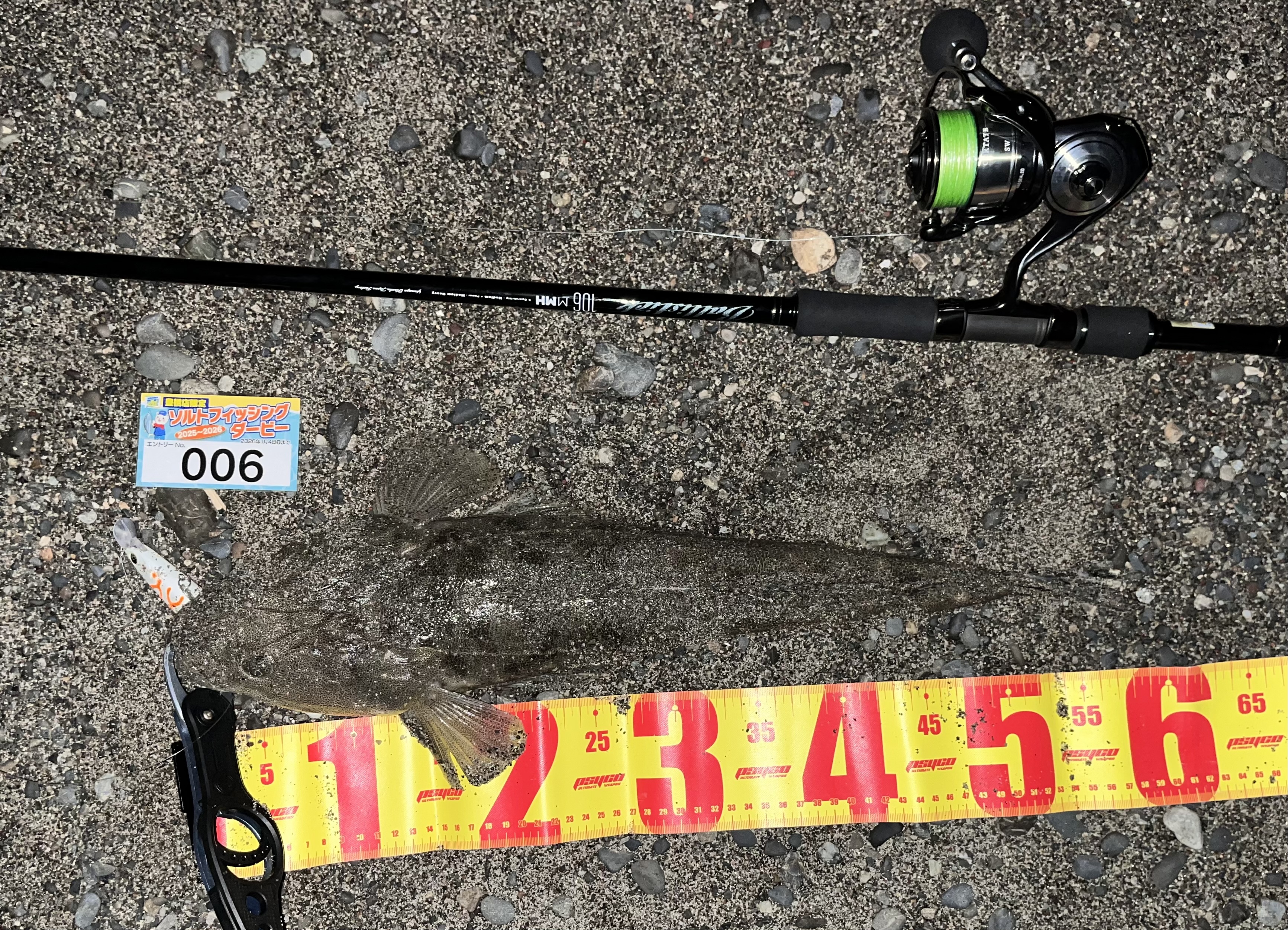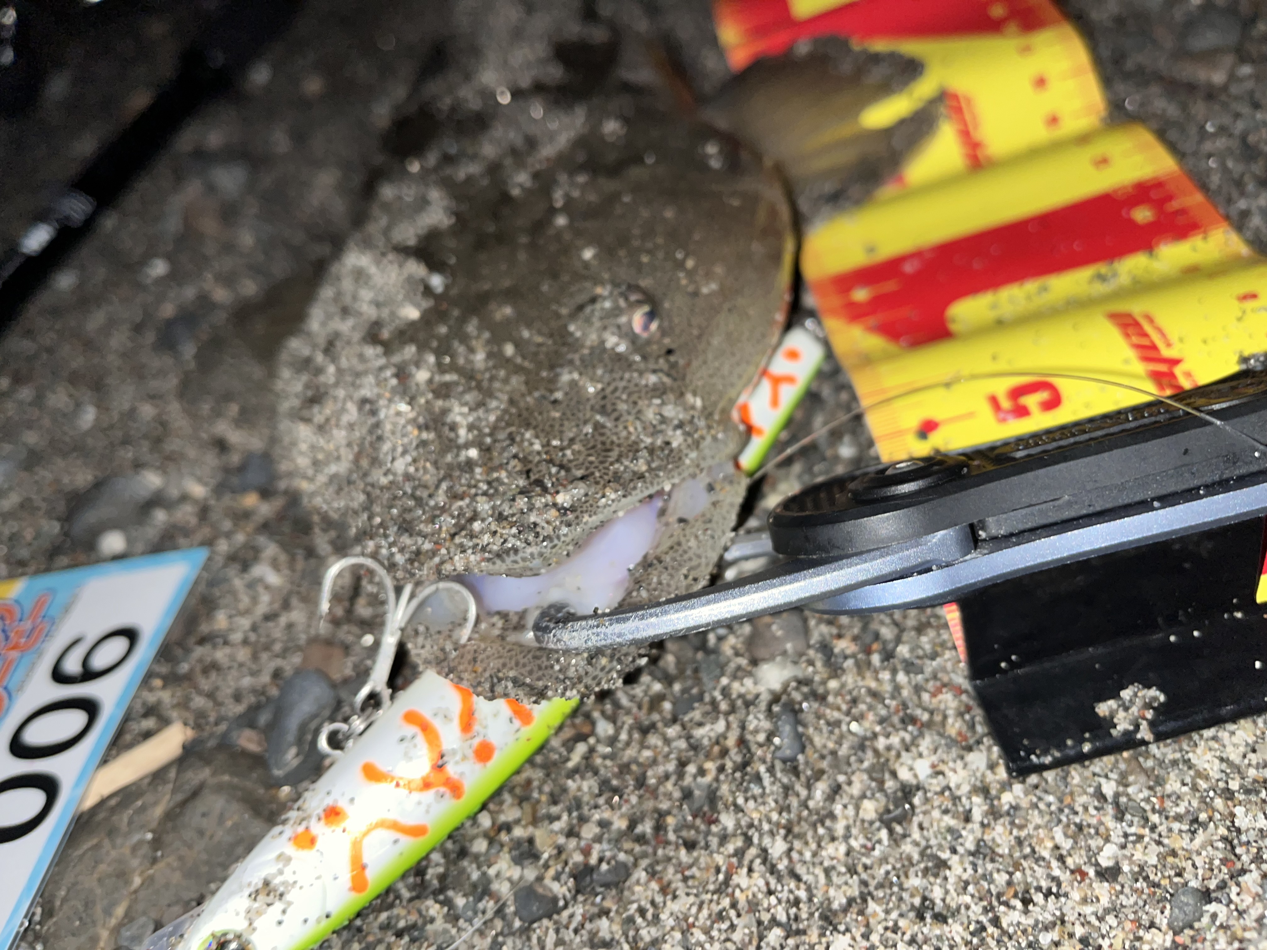 そこから反応がなくそろそろ帰るかと思い、最後にブレイクになってそうなポイントがあったので、ロンジンのハイスタンダード150をキャストして巻き始めてすぐにアタリがあり、慎重に釣り上げてみると58センチの良型マゴチが釣れました。粘ってみた甲斐がありました。