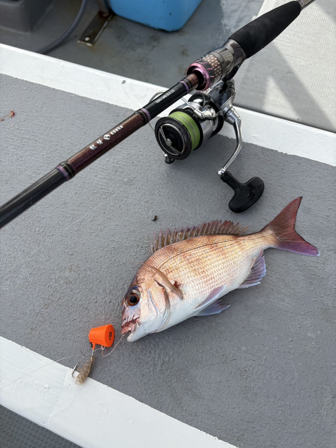 エビをつけて着底させ、2〜3回程度シャクり、テンションフォールさせていきます。ハヤブサ「無双真鯛貫撃テンヤ2 10号」UVアピールオレンジを使用しました。エビがずれにくいエビロッカーを搭載しているため、激しいアクションをしてもズレることがありません。