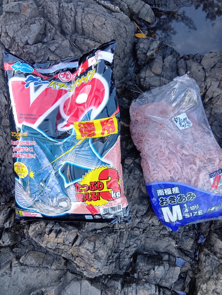 開始1時間ほどでここで風向きが向かい風になり、まき餌が撒けなかったので生オキアミと集魚剤をまぜました。