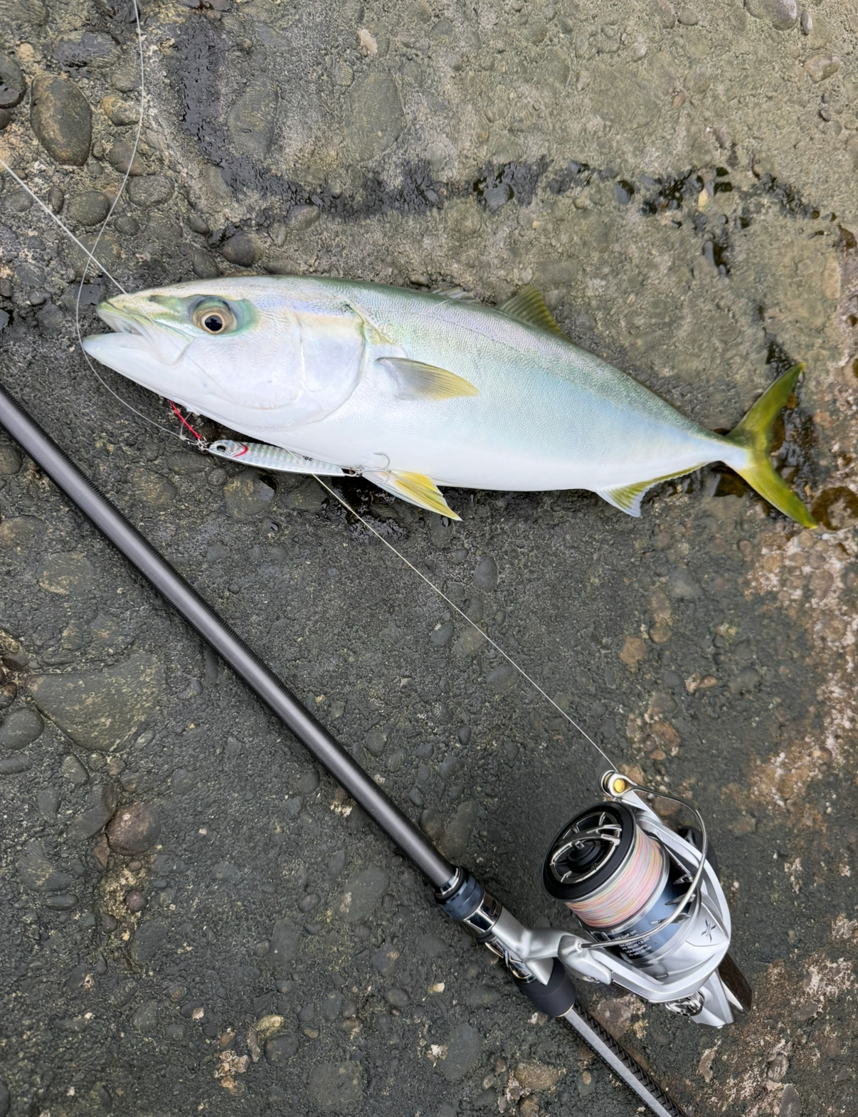 社内ショアルアー大会に参戦してきました!朝は盛大に寝坊し、急いで支度してから南伊勢方面へGO!平日の朝イチ終わりということで人はゼロ!ちょっと肌寒いですがスタート。時折ベイトが追われて気配はむんむん。シルバー系のジグがいいかな?と思いサムライジグの20gをチョイス。何度かチャンスはあるがタイミングが合わず不発連発。。。魚の動きを読み先回りポイントにキャストすると猛烈にチェイス!バイトからしっかりフッキングしてハマチゲット!46センチ!その後もバラシはあるもののアタリは多くやる気ある!1匹30センチクラスを追加して終了。気温も下がり切る前で人も釣りがしやすいシーズン!ショアジグに出かけよう!