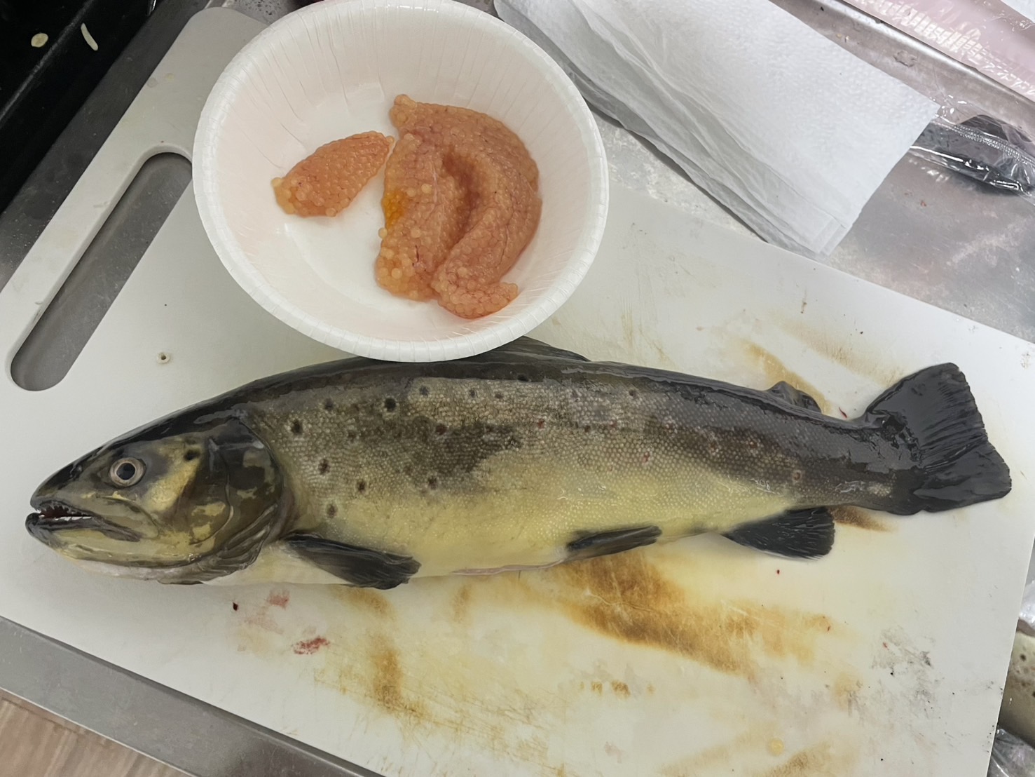 和田先生が釣ったブラウントラウトを頂いてしまいました。イクラが入ってる奇跡。そして教えの通りにやったら僕も1投でブラウントラウトが釣れてしまいました!