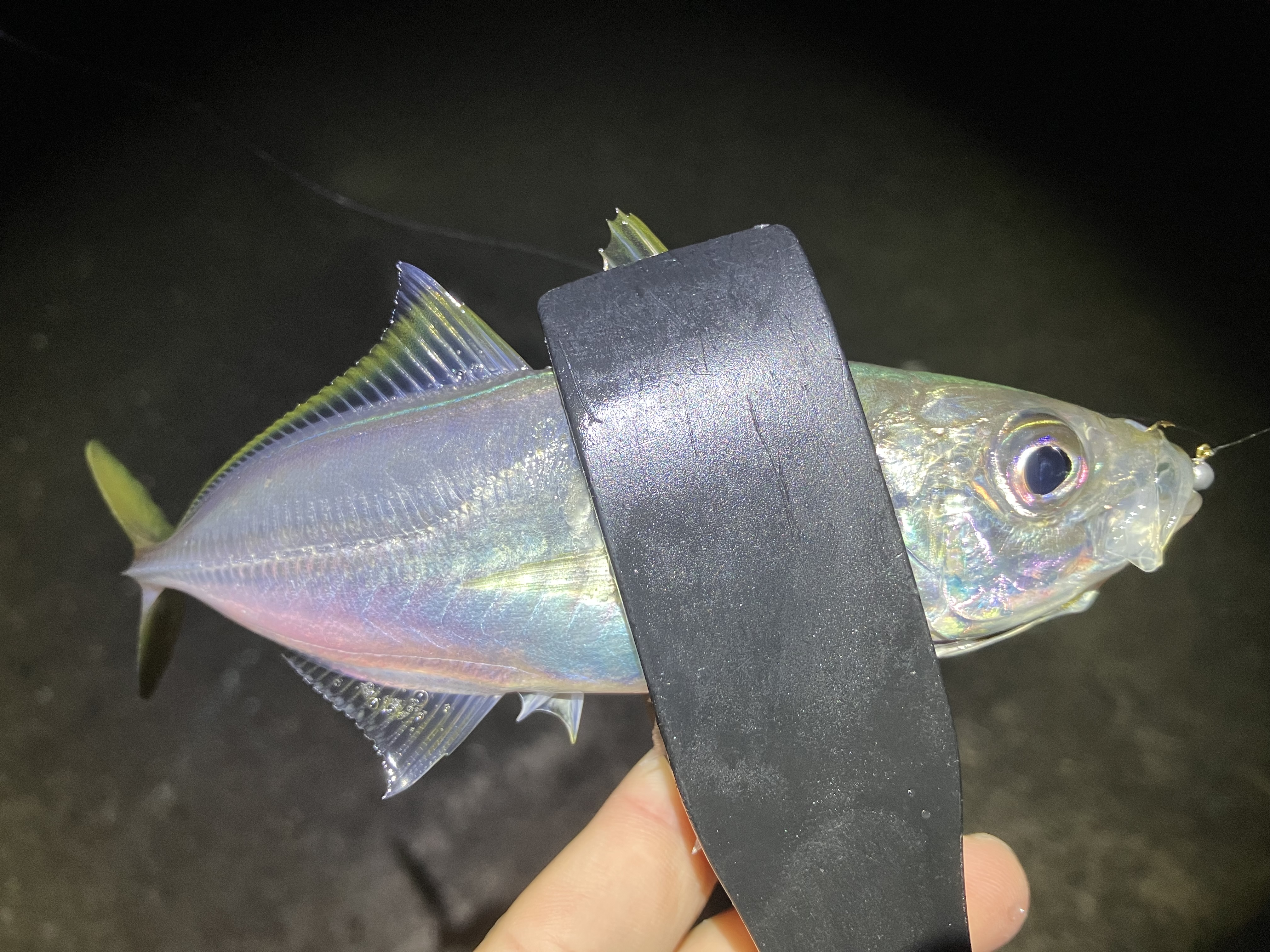 ワームをキャストして、表層をリフト&フォールで誘うとフォール中にコツンと当たり!幸先よく釣れてくれたのは20センチほどのナイスアジ!アジのサイズも大きくなってきましたね(#´ᗜ`#)