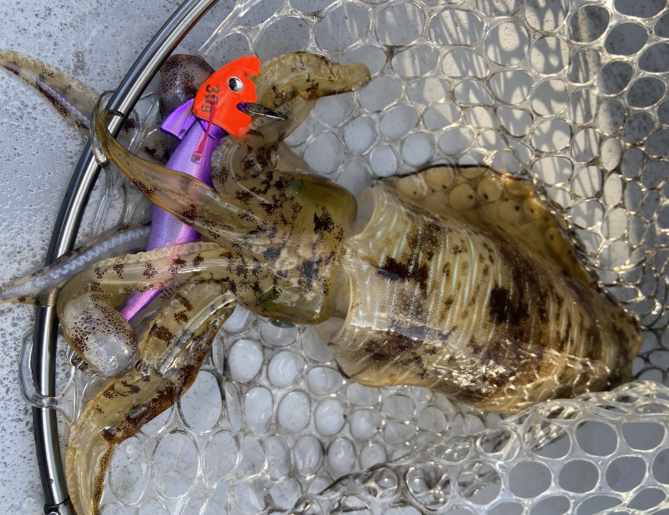 船中ポツポツアオリイカが釣れていて私にも穂先のテンションが抜けるアタリでヒット!いいサイズのアオリイカが釣れました!ヒットエギはクレイジーオーシャンさん「ティップランナー3.5号」でした!