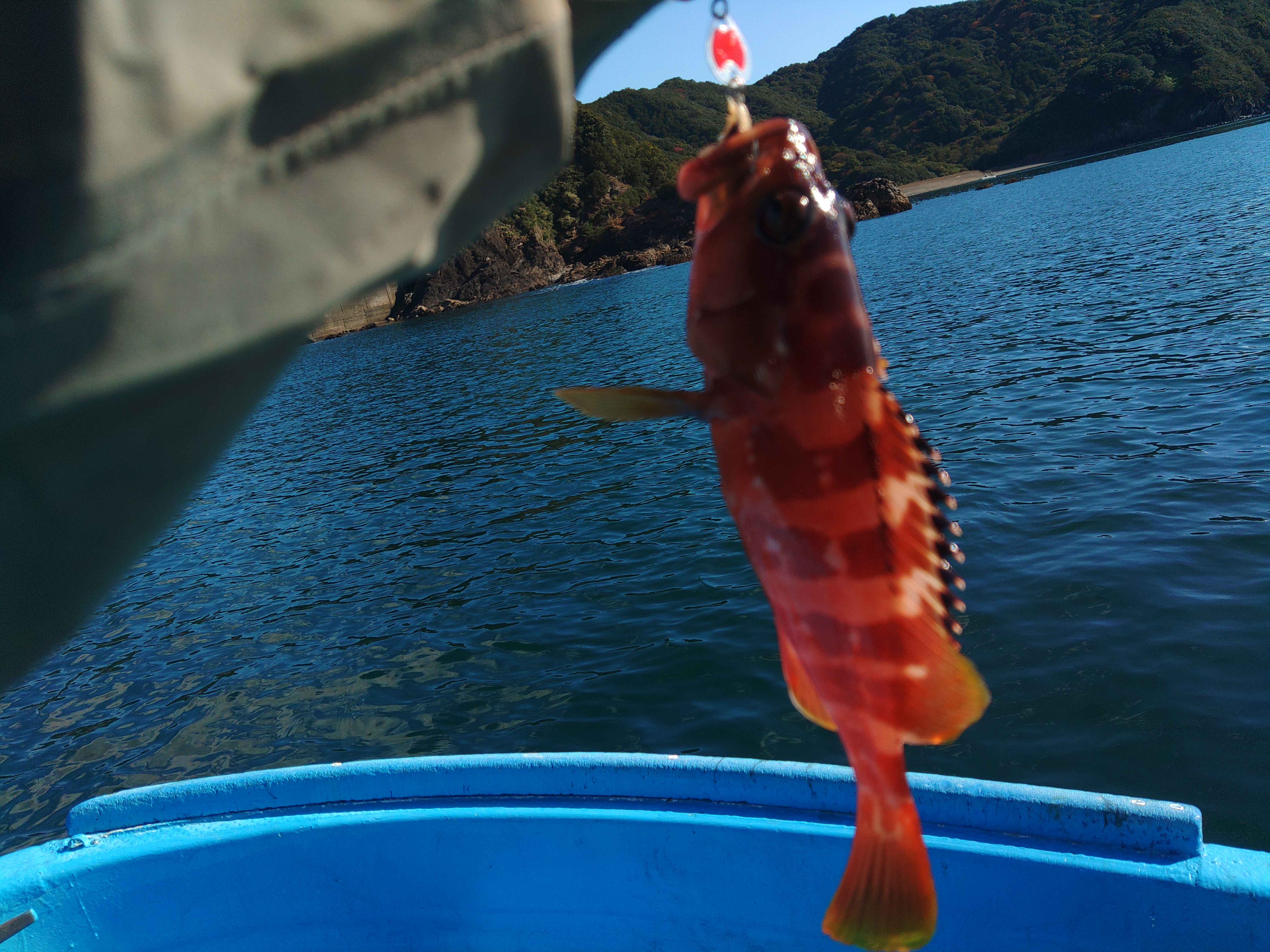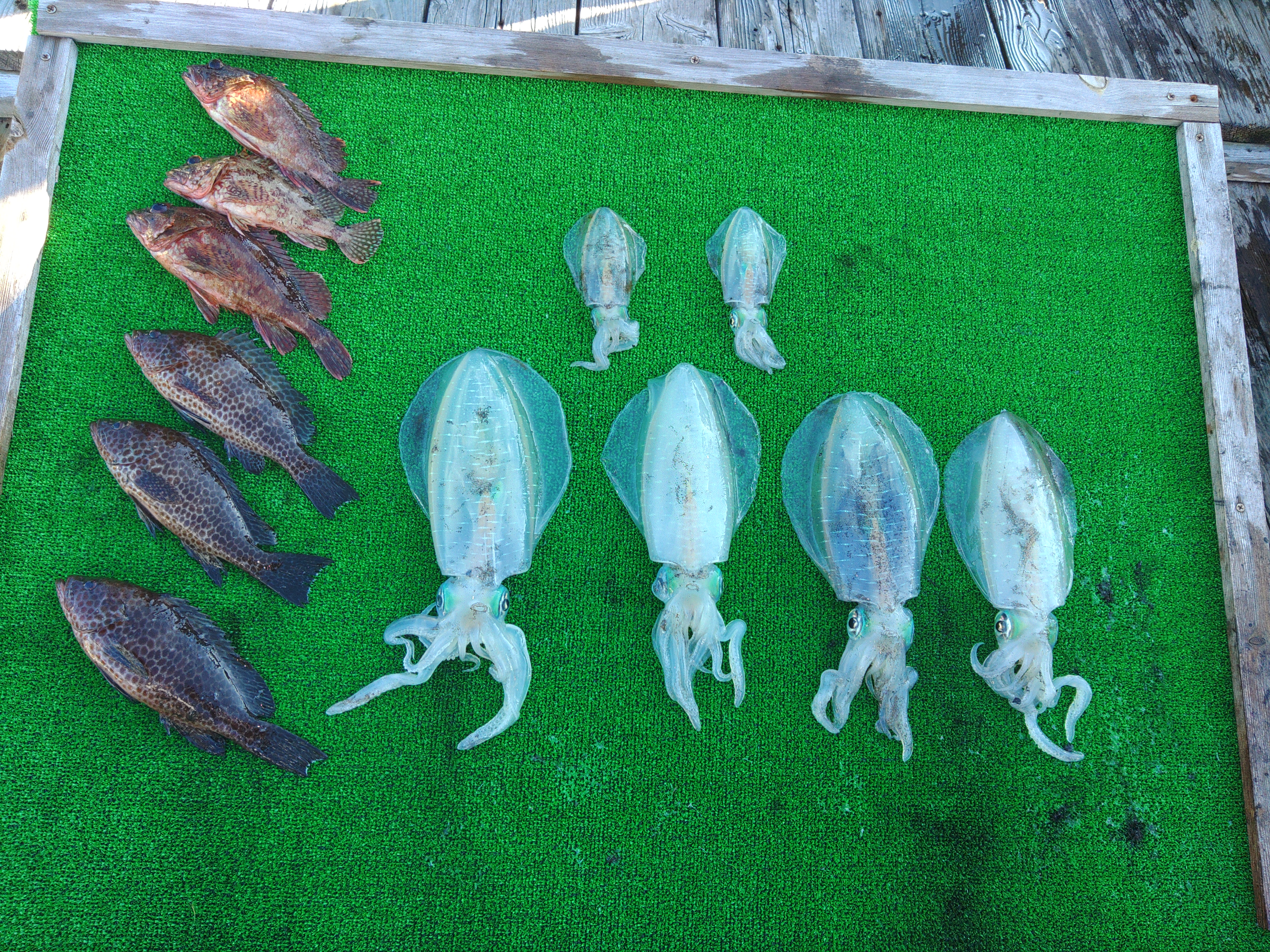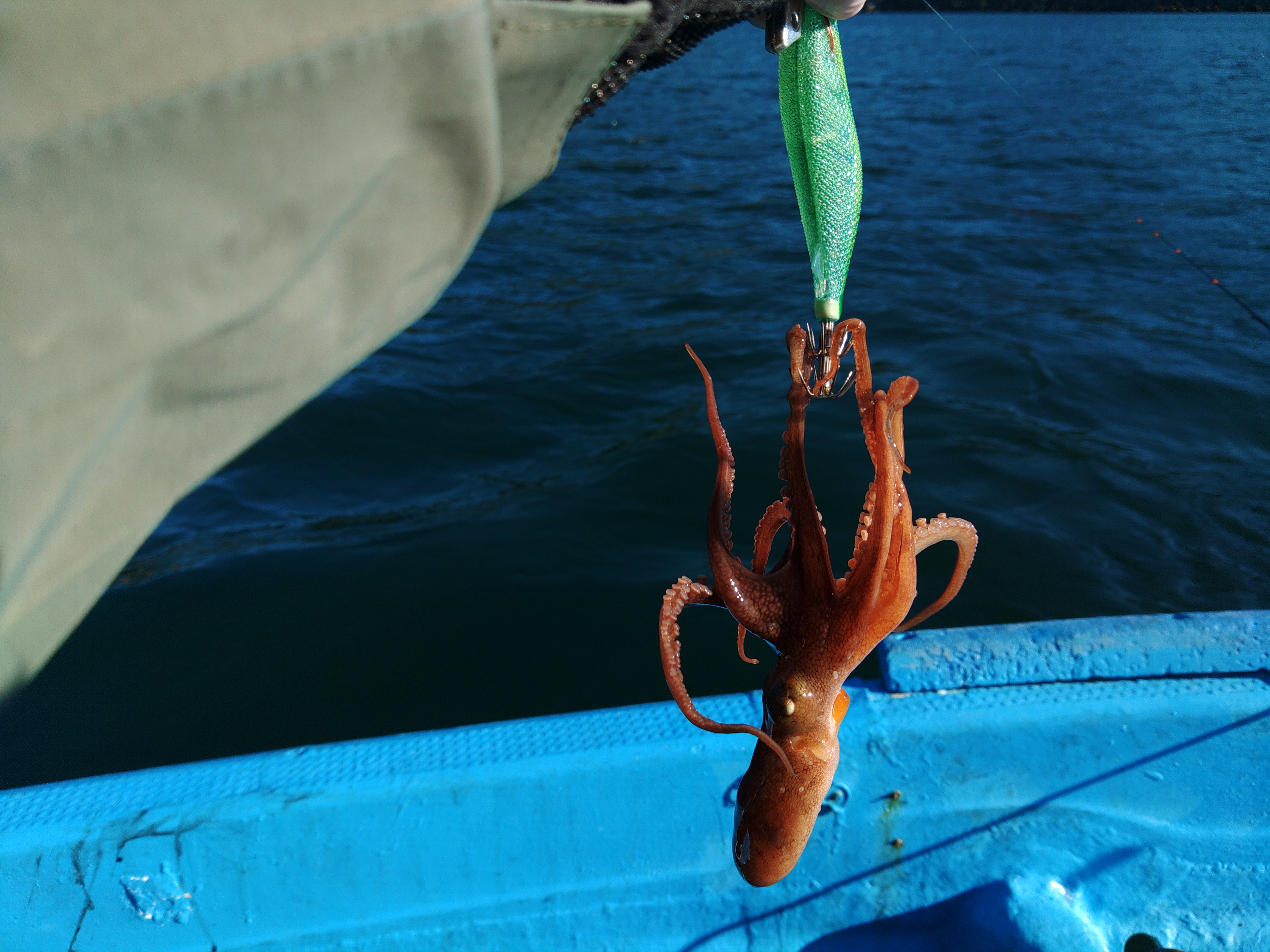 ポイントを何度か移動し水深15mぐらいの所でようやく前アタリが出てすぐにしゃくり直すとヒット!釣り上がったのは5~600gのまずまずサイズのアオリイカ!とりあえずボーズは無くなり一安心。しかし、その後はヒットが続かず1時間経過。 その後、湾内の岩礁帯周りでイイダコがヒット? ポイントを移動してすぐに最初と同寸サイズのアオリイカがヒット! しかし、またもや単発で後が続かず潮も風も止まってしまいました。 そのタイミングで岩礁周りで根魚を狙い、アカハタやオオモンハタ、カサゴなどを釣って1時間ほど遊んでからアオリイカ釣りに戻り、コロッケサイズを1杯追加して納竿となりました。