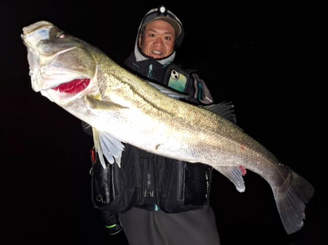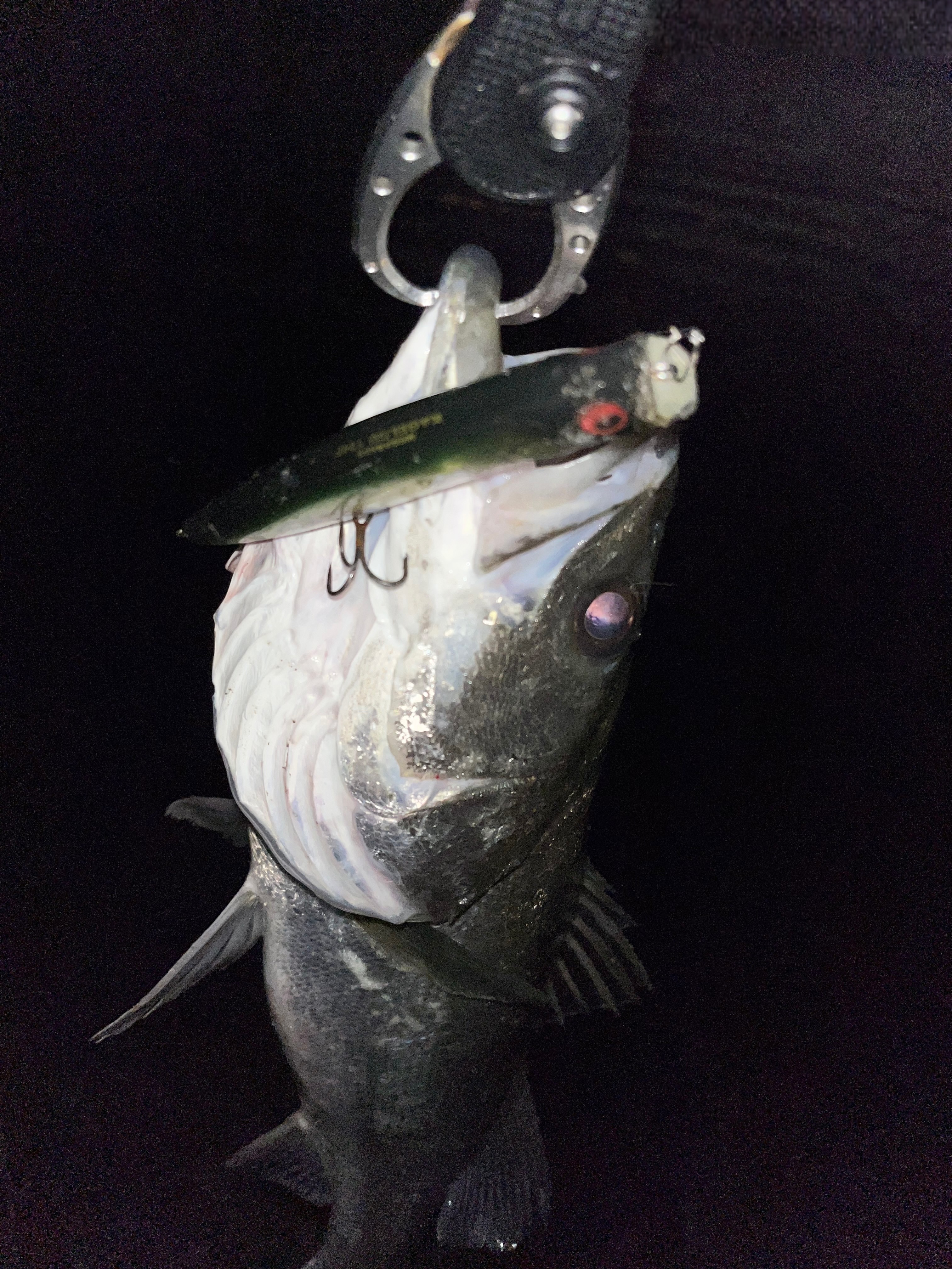 干潮2時間前くらいに入水。フローティングミノー主体にローテーションしながらキャストするもバイト無く干潮間際の流れが緩んだタイミングでバイト!60cmほどのシーバス!ヒットルアーはメガバスさんのカゲロウ124f。