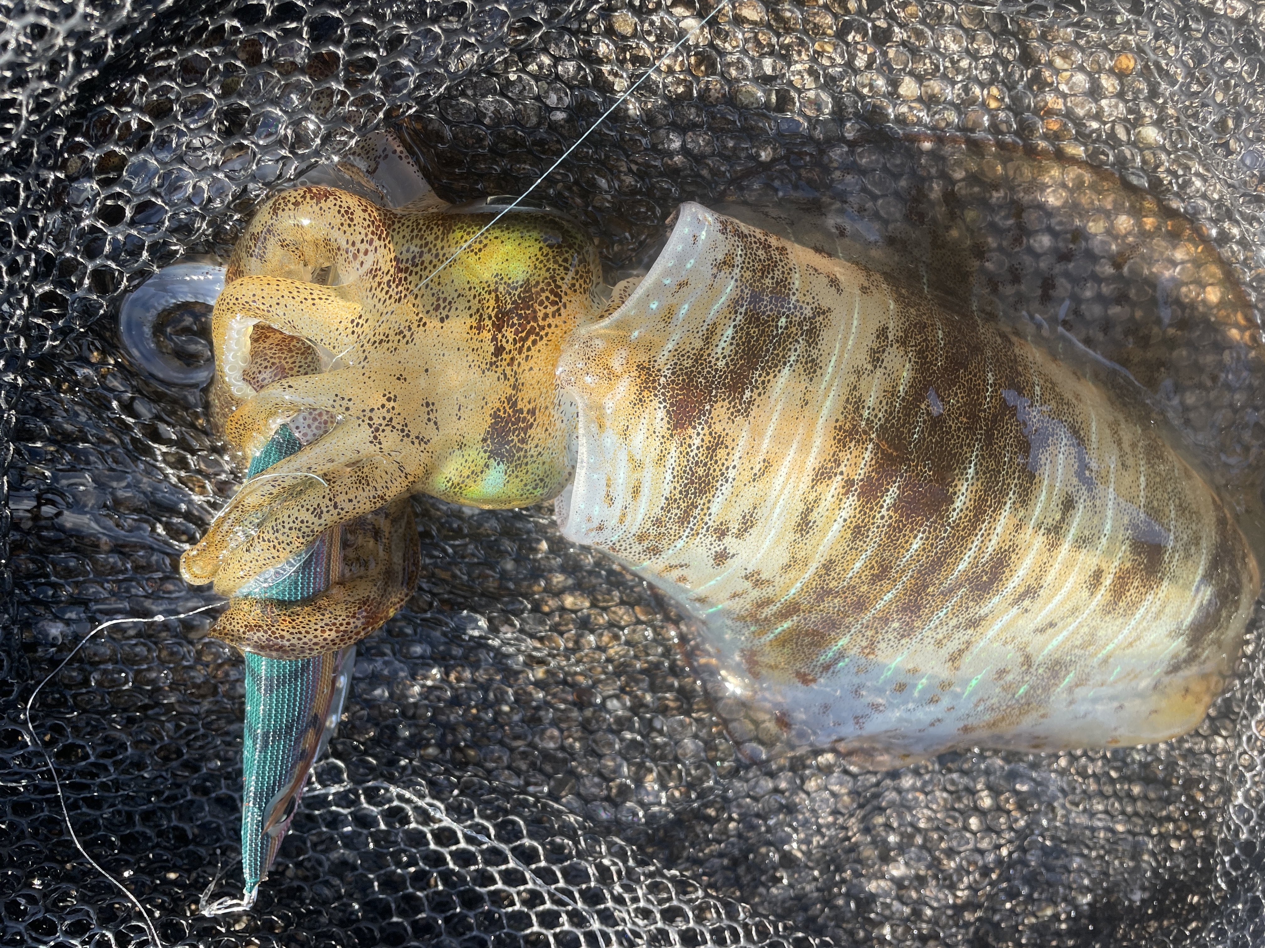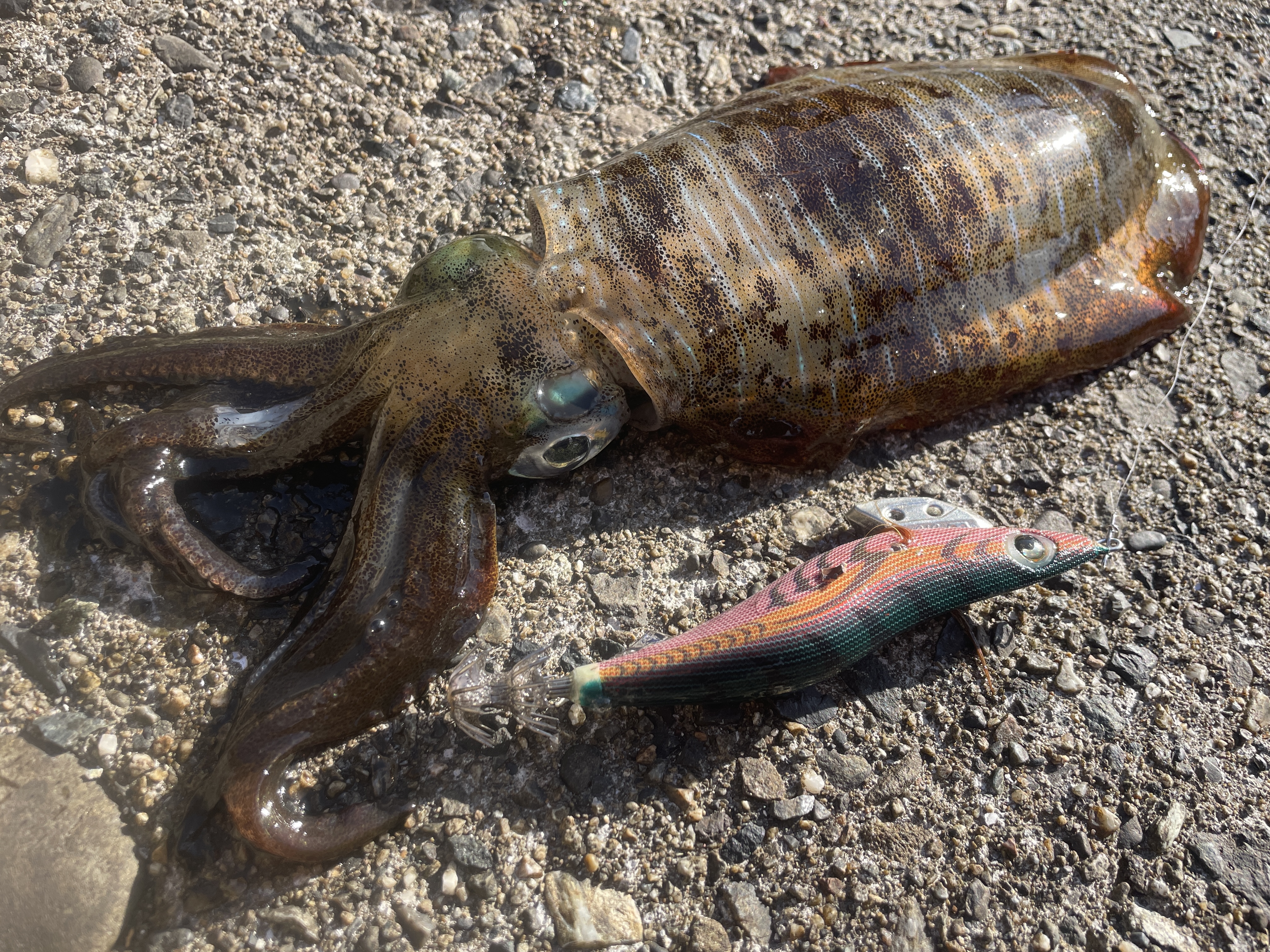 潮が動いていれば可能性はあるので、30分やって釣れなかったら青物狙いでポイント移動しようと思い、一投目ヤマシタさんの【エギ王K3.5号 軍艦グリーン】を投げて着底。しゃくってしゃくって『ちょっとドラグ強いかな、、、』と思ってテンションフォールさせながらドラグを調整していると、竿が引っ張られる。バシッと合わせると良い重量感!上がってきたのは600〜700gくらいのアオリイカ!