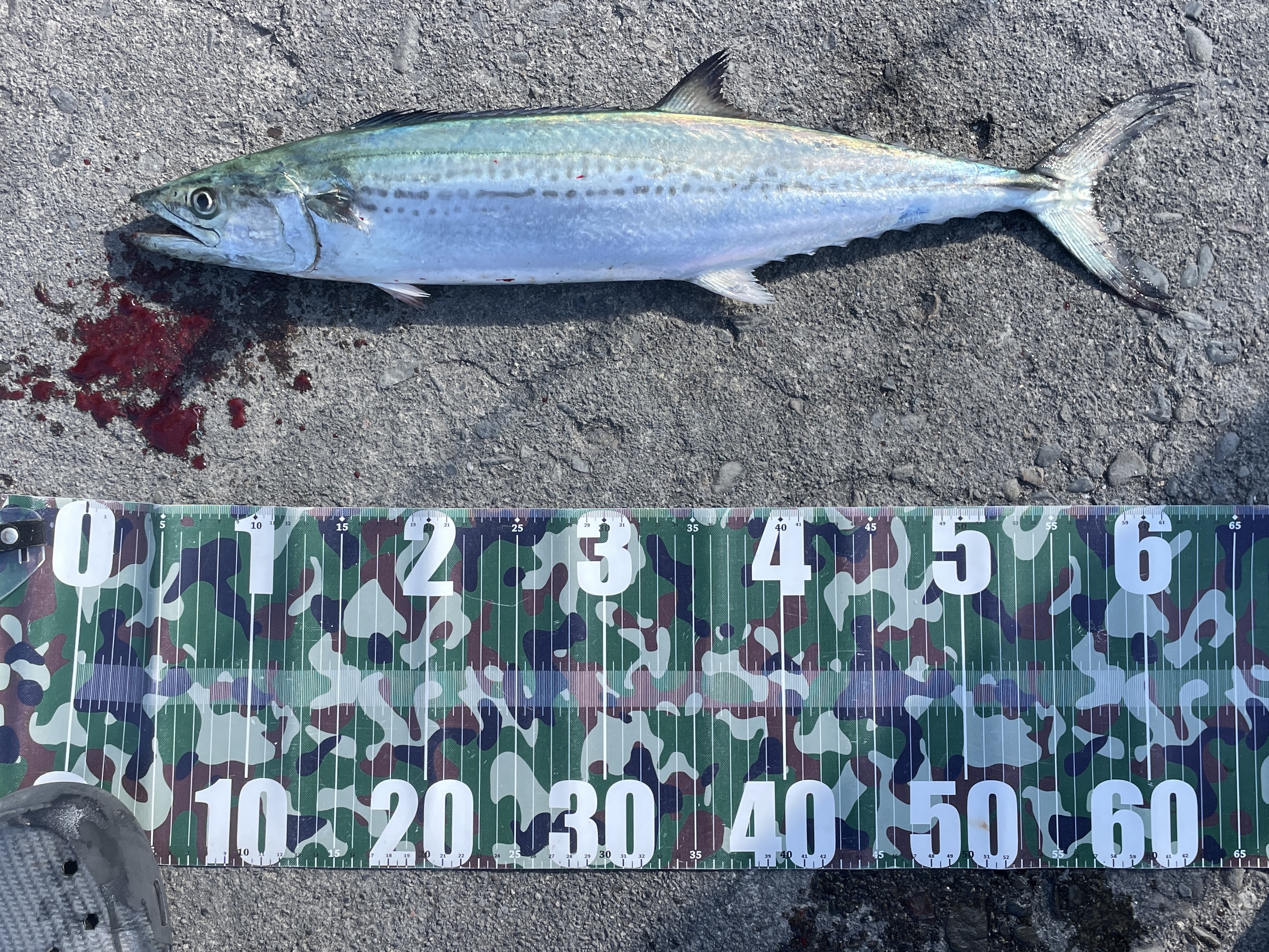 最高のスタートダッシュ!その後も同じエギで同サイズをもう一杯追加!30分ほどで2杯釣れました!その後流れが止まってしまい、時合終了。その後青物リベンジのために移動。干潮潮止まり前後狙いで青物を狙っていると、同行者が【メタルマジックTG40g】で60cmを超えるサゴシヒット!