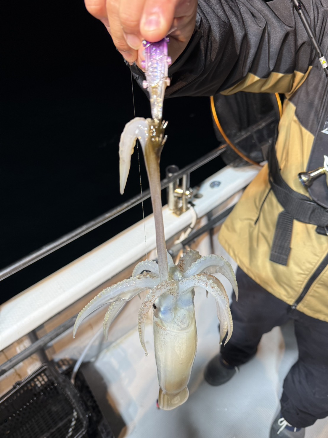 三重県紀伊長島港出船の「明栄丸」さんに行ってきました。今回はバチコンで「アジ」狙いです。16時半ごろに出船し尾鷲方面のポイントへ。水深は60m程。潮が少し速く40号のシンカーでスタート。しばらくボトム付近を探るものの反応なく、魚探に反応出た棚を攻めるもののこれも反応なし…。ここ数日でスルメイカが釣れ始めて同船者の方が釣っているのを見て、イカメタルにチェンジ。鉛スッテは「メタラー25号」、ドロッパーはエサ巻きの「バインドアッパー」棚はバラバラで30m~50m。50mから誘い上げ、ロングステイでヒット♬ずっしりとした重みでトルクのある引きで上がってきたのはいいサイズのスルメイカ!その後もポツポツスルメイカがヒットしてくる状況…。本命のアジはあの手この手で狙いましたが反応なし…。他の船もアジは全くという事でした…。バチコンはリベンジ確定!!