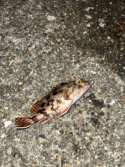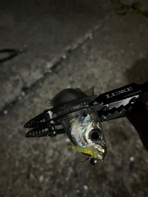 満潮から下げの20時〜の釣行!透明度が高く、見えカサゴは入れ食い。でも本命はアジなのでジグヘッド0.8gにワームはレイン アジアダーのチャート。表層をゆっくり巻いてくるとガツンと!元気いっぱいのアジが上がってきました。