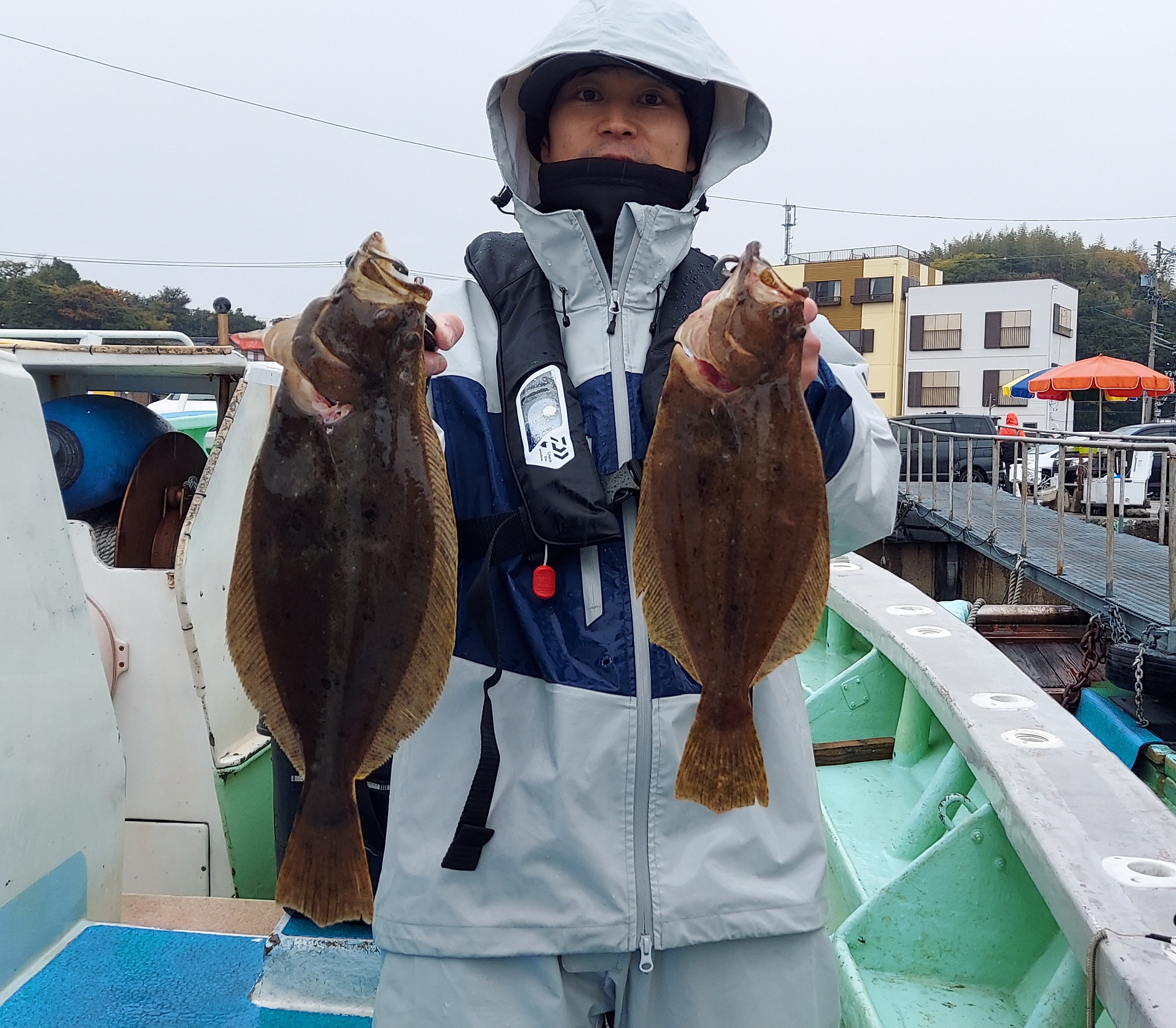 七福丸様にお世話になりヒラメ釣りに行って来ました!今季も船ヒラメのシーズンに入り、各船宿さん絶好調のようです。私は数年ぶりの釣行で、釣行前からわくわくが止まりません。当日6:15より座席の抽選がありますので間に合うように向かいました。七福丸様はまず駐車場の誘導をしていただけるのが素晴らしいところです。誘導のお陰で綺麗に駐車できます。受付を済ませ時間までは車で仮眠しても良し、休憩所やトイレもあり仕掛けも現地で購入可能です。氷は受付後に1袋無料で配布されます。今の季節では十分ですが、夏場はクーラーの保冷機能によっては持参する必要があるかもしれません。座席の抽選が終わったら荷物を積み込みます。今回のポイントは港から出てすぐの師崎沖です。このポイントは青物や大型ヒラメが釣れるようでハリス12号の太いハリスが推奨ですとアナウンスがありましたが、持っていなかったのでポイントに着く間に持っていたハリス10号で作り直しました。オモリは60号統一です。イワシを付けていざ実釣!ボトムまで落としたら1m上げて待ちます。沈黙が続きます。すると隣のお客様に青物がヒット!丸々と太った良いワラサでした!羨ましい・・・。続いてその隣の方が本命の良型ヒラメを釣られました。ん~来ない・・・。すると9時過ぎた辺りでようやく反応が!!ゴンゴンとアタリがあり、セオリー通り40秒待ってアワセ!中乗りさんに無事タモ入れしていただき安堵しました。40cm台の本命ヒラメです。中乗りさんが針外しまでやっていただけるのですが、見てもらうとトレブルフックが胃の奥まで飲まれているぐらいでした。ちょっとアタリが遠のき、ポイント移動することに。着いた場所はとても浅場でした。ハリスを8号に変更してやっていると、ヒット!前アタリも何も無しで飛びついてきたみたいでした。上がってきたのは30cm台のヒラメです。なんとか2枚ゲット。その後は、エサのイワシが背中をかじられたり、ゴンっというアタリでエサだけ取られたりで、13時納竿の時間になってしまいました。結果は4バイト2キャッチです。同船者の方は50~60cm台のヒラメを釣られていました。ヒラメも青物も両方狙えるので、興味のある方は是非お出かけ下さい!