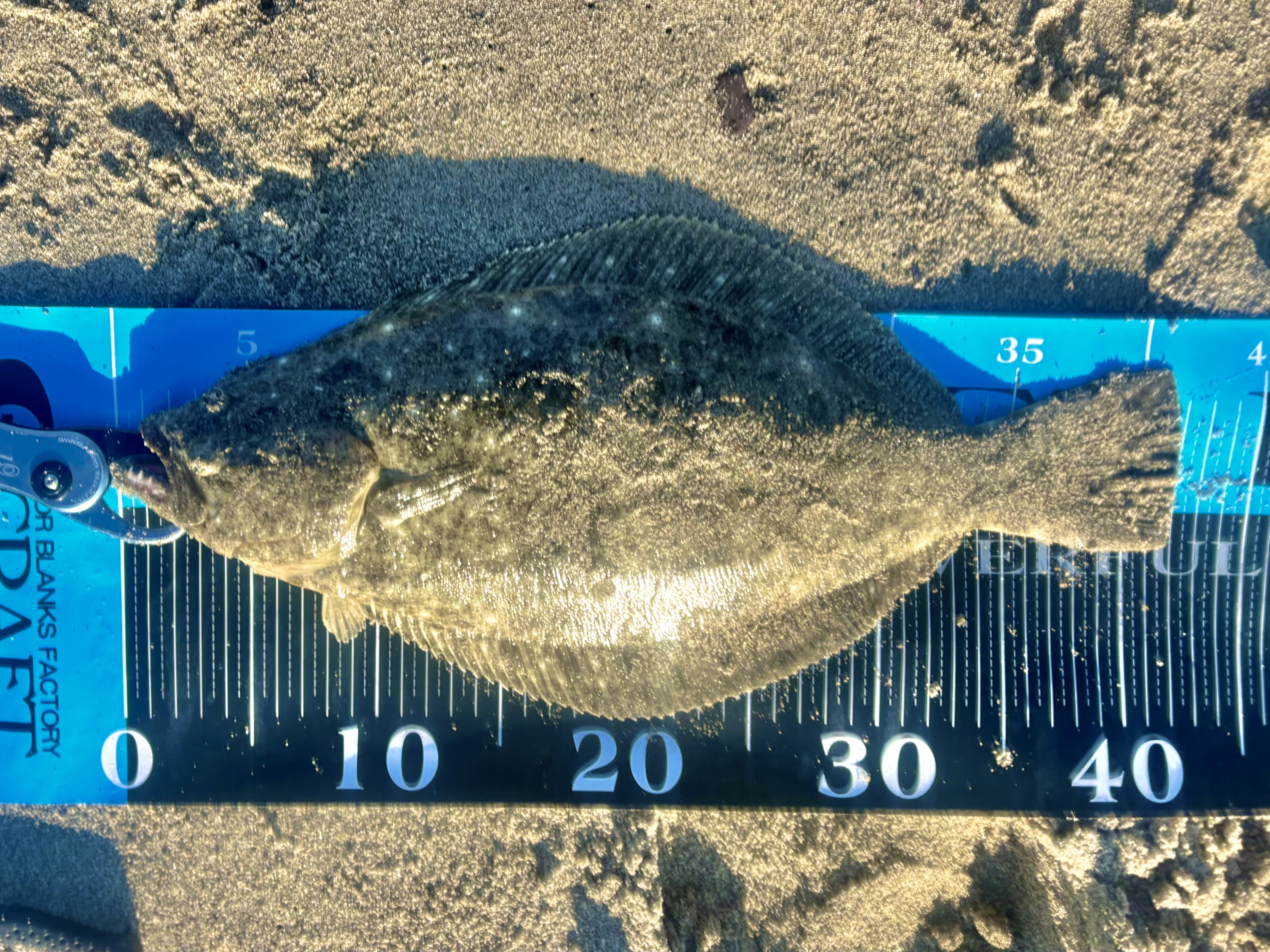 サーフは最近スランプ気味なので、今回はいつもよりも丁寧にやっていくことに。闇雲に投げずにしっかり海面を観察して、波の立ちづらい深場や離岸流を探します。ロンジンのストームブレイカー33gをバタつきすぎない程度のスピードを意識してストップ&ゴーで探ります!引き抵抗の強いポイントを見つけ、いろんな方向から丁寧に探るとヒット!40センチオーバーの久々のヒラメサイズが来てくれました!