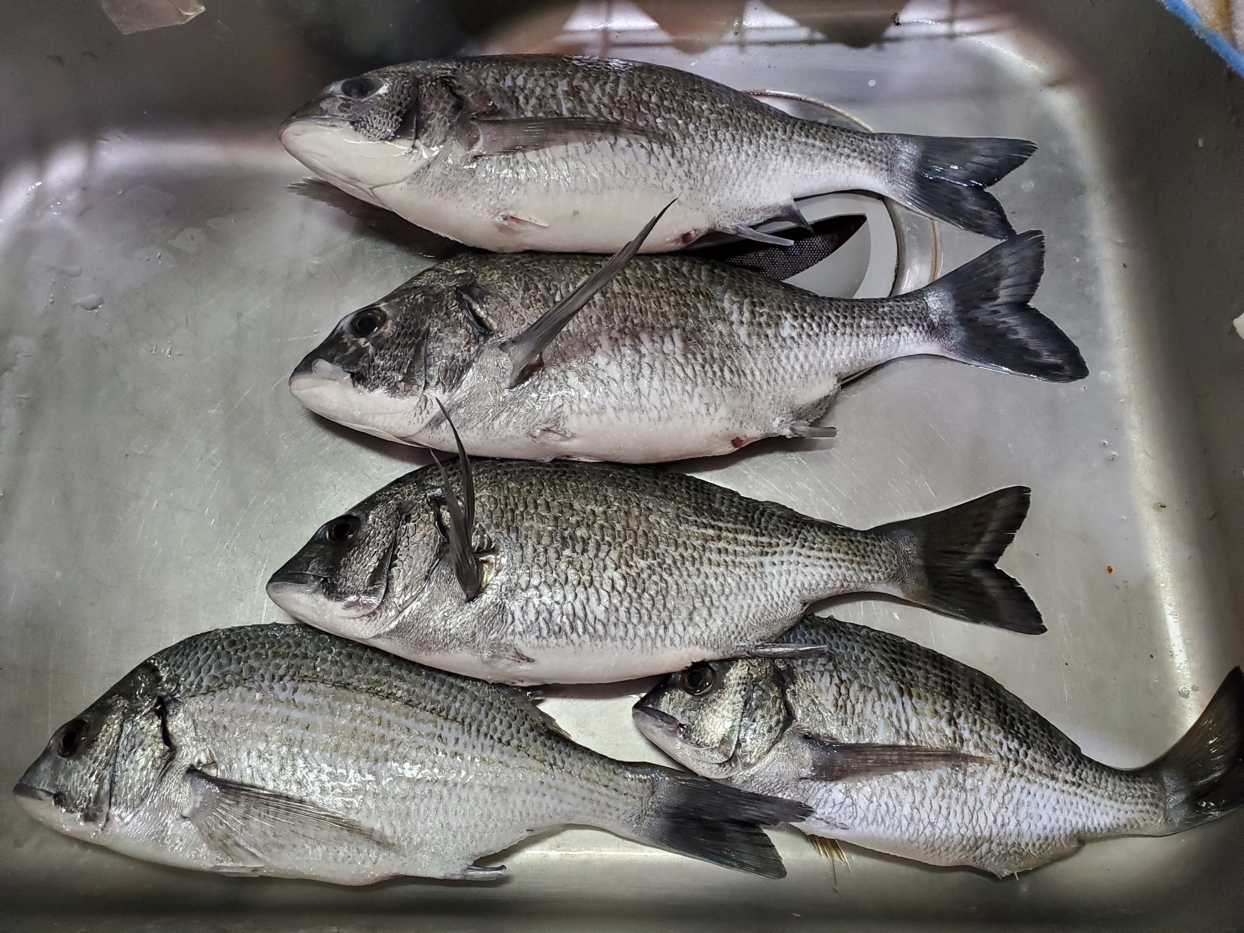 ここのポイントは回遊のチヌなのか、めちゃくちゃキレイな魚体でした。持ち帰る5匹だけをキープし、後はリリース…。