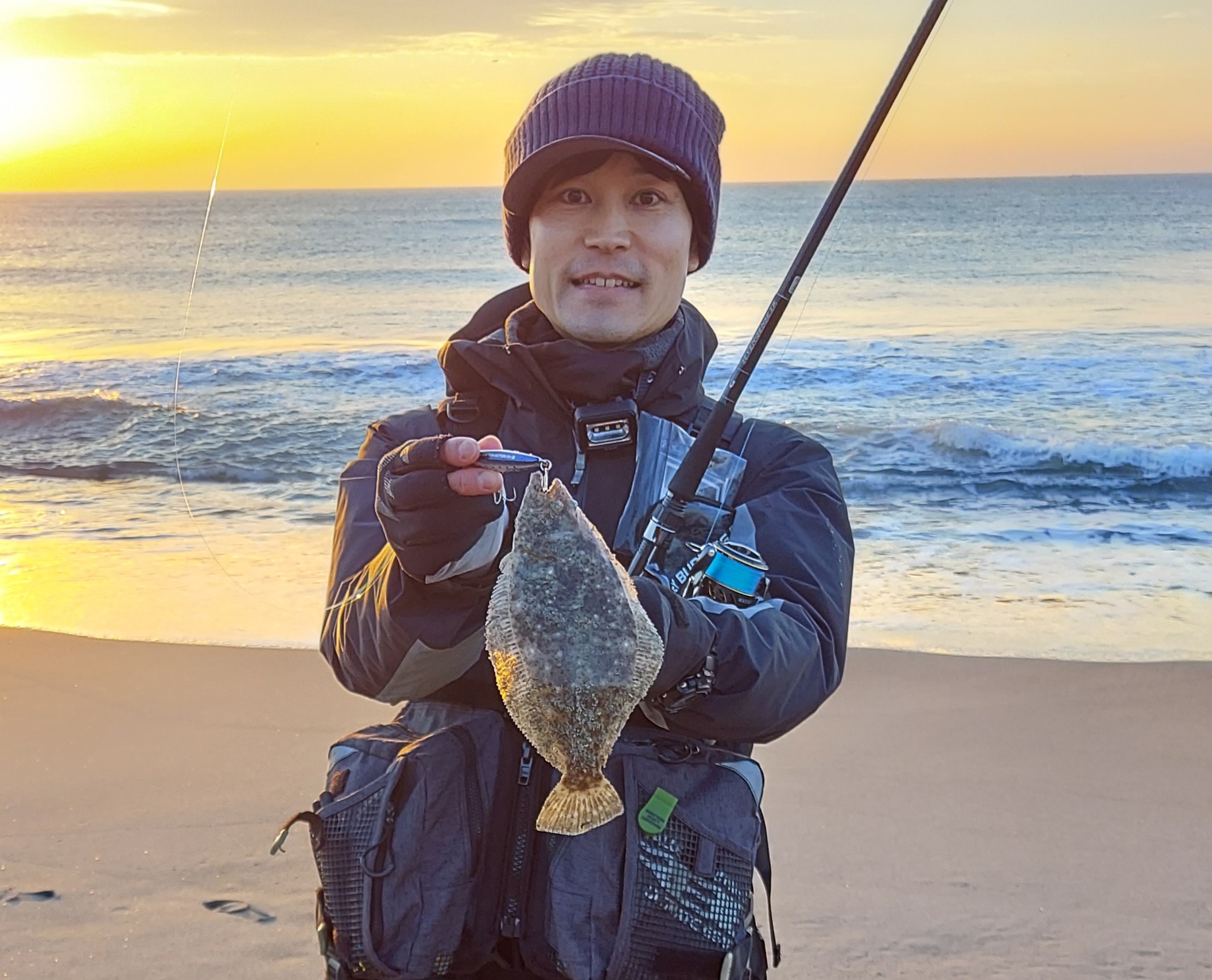 表浜サーフに行って来ました!当日は当店スタッフの石橋氏に同行させてもらいました。名古屋を0時に出発し、夜のうちからやってシーバスを狙う算段です。3時半頃エントリー、使うルアーはミノーです。ショアラインシャイナーで浅場を引いて来ますが、無・・・。何も無いまま6時のゴールデンタイムを迎えます。ミノー、シンペン、バイブレーションなど一通り試しますが反応無し。ルアーのサイズを小さくしてみます。スイッチヒッターDH76Sを使います。このルアーは飛距離抜群で浮き上がりが速いので、浅場向きです。サーフなんかではデッドスローで巻くか、リフト&フォールがおすすめです。ゆっくり巻いてきて手前のブレイクに差し掛かった瞬間ヒット!小さそうですが慎重に寄せてくるとソゲをキャッチできました。写真を撮らせてもらいリリース。とりあえずボウズ逃れ出来ました。その後は、オフベイト30gで飛距離を稼ぎ広範囲に探るとヒット!さっきよりは大きそう!と思いましたが痛恨のバラシ・・・。マゴチかなんかでしょうか。気を取り直してやっているとまた小さ目の反応!シタビラメがスレで釣れました。これも写真を撮ってリリース!今回は大型魚は釣れませんでしたが、沖では鳥が旋回していたのでベイト次第で今後は出来るかもしれません。平日でしたが、沢山のアングラーさんが来られていました。みなさん奇麗に等間隔に並ばれていて無理な横入りとかは無くマナーはとても良かったです。いつもこのような気持ちの良い釣りが出来るように啓発していきたいです。