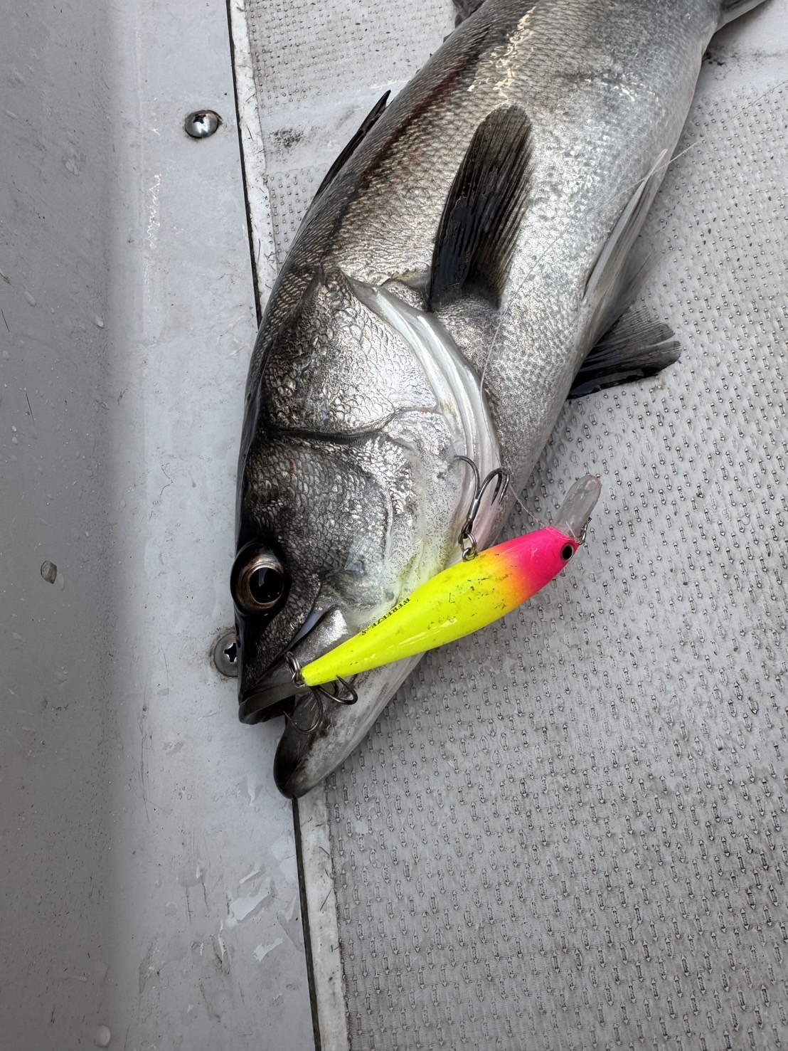 今回はキャスト練習も兼ねて同店の田野岡くんとエッジさんにお世話になりました。1ヶ月遅れでミノーでよく釣れているとのことで期待大です。満潮潮止まりからのスタートです。ビーフリーズ78Sを投げ倒していきます。バース打ちからまずは田野岡君にヒット!ルアーはビーフリーズ78Sのブロビスカラーでした。チェイスは多く活性はいい感じです。温排水がらみに移動しタンカーの際に投げ込んでいくとヒット!とりあえずシーバスの引きを堪能し、穴打ちへ。30~40cmくらいのシーバスがわらわらとチェイスしてきます。ある程度手前で釣ると一時反応が鈍くなりますが、奥に投げ込み魚をかけると再びスイッチが入ります!ミノーで数釣りができると楽しいです!ランカーは出ませんでしたが60cmほどのサイズも釣れたので大満足の釣行となりました!