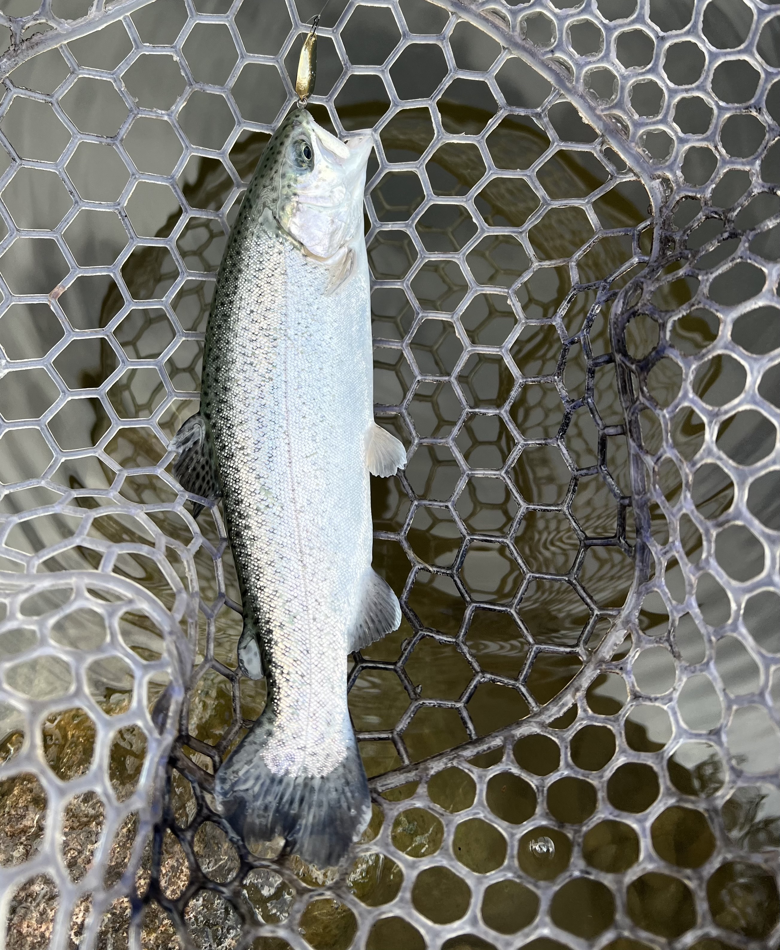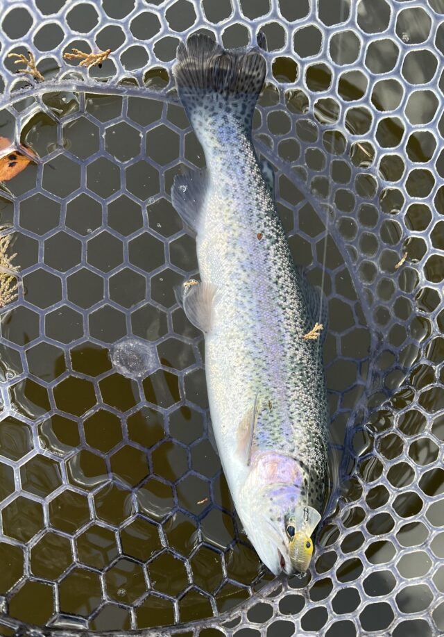 この日は久しぶりにフィッシングサンクチュアリさまにお邪魔しました。雪が降っていたらしくかなり寒くなっていたので防寒をしっかり身につけるのをオススメします!序盤はスプーンで始めるもパターンが分からず苦戦。少し移動してロデオクラフト様のジキル1.1gを使用し、巻き下げるもしくは巻き上げやタップするなど様々な誘い方で連続キャッチ!その他ジャッカル様のちびパニクラDR・DRSSやペピーノMR、なぶらや様のアキュラシー0.9gを巻き下げて使うと連発出来ました。途中あめや雹が降って来てかなり寒かったですが魚は元気!ぜひ行ってみてください!