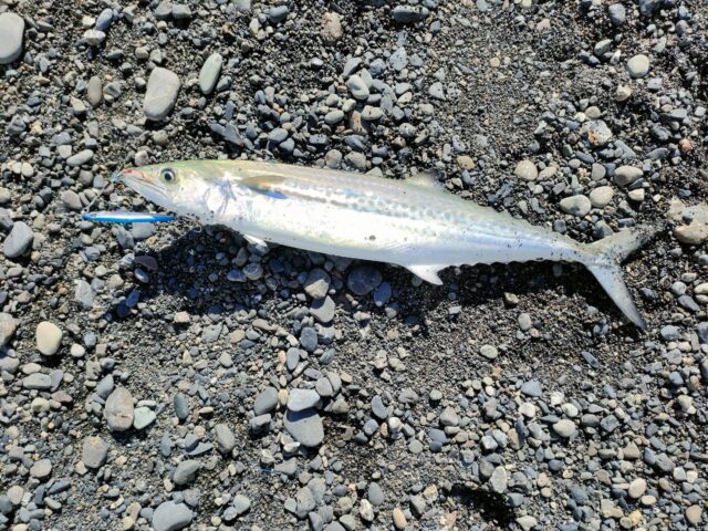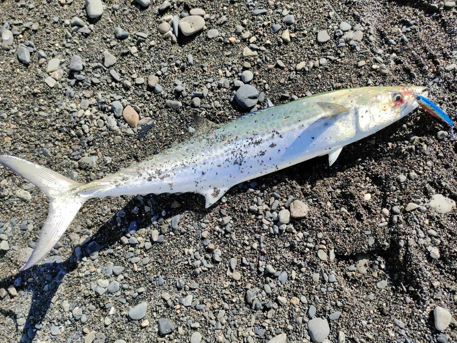 するとすぐに、ゆっくり目のワンピッチでヒット♪大きな波に注意しながら浜にズリ上げると50cmほどのサゴシをキャッチ!