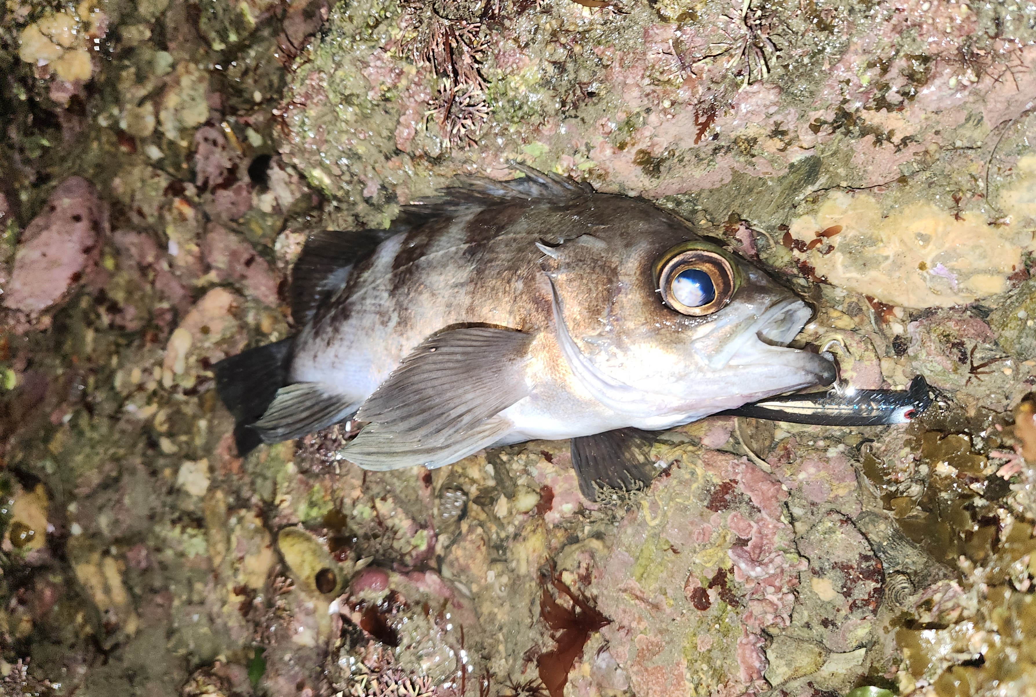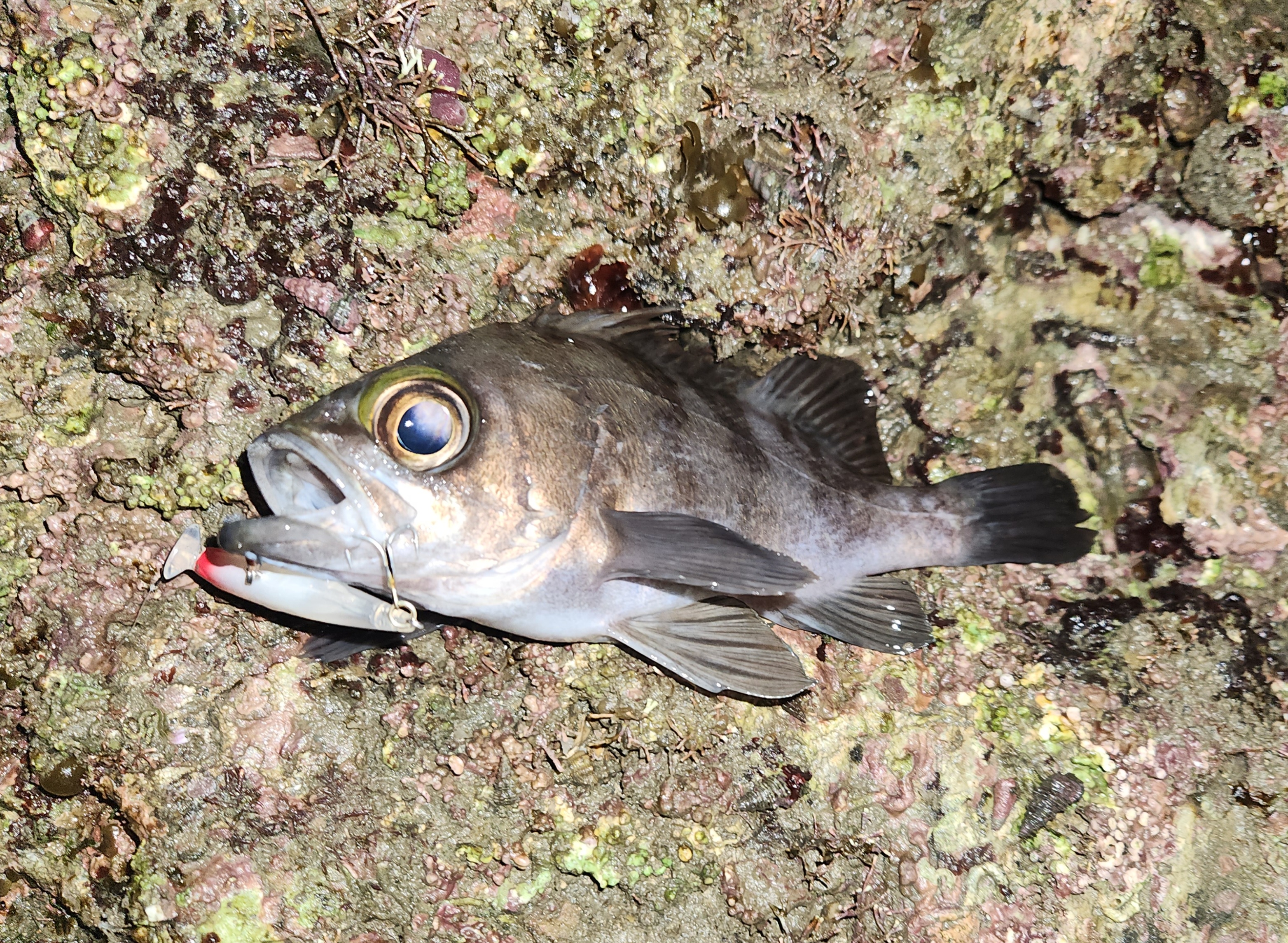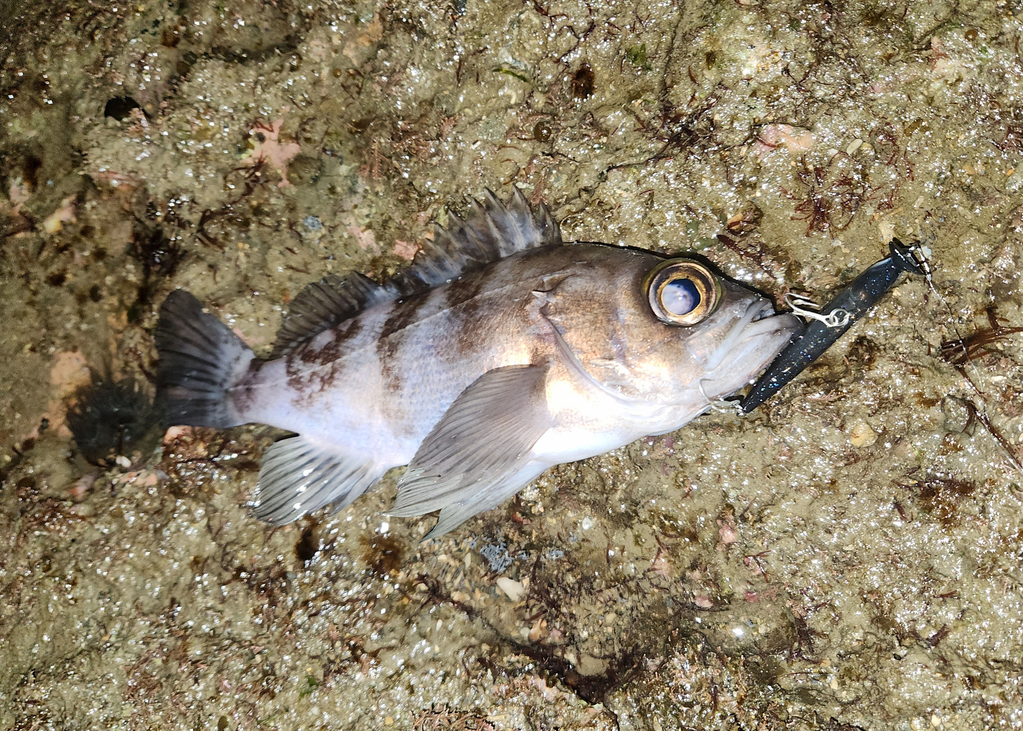 干潮付近にポイントへ。潮位がかなり低いのでウェーディングして沖を狙います。移動しながら反応を探ると前アタリがあり、そのまま巻いてくると大きなアタリに変わったので合わせてヒット!20cmくらいのいいメバルでした!