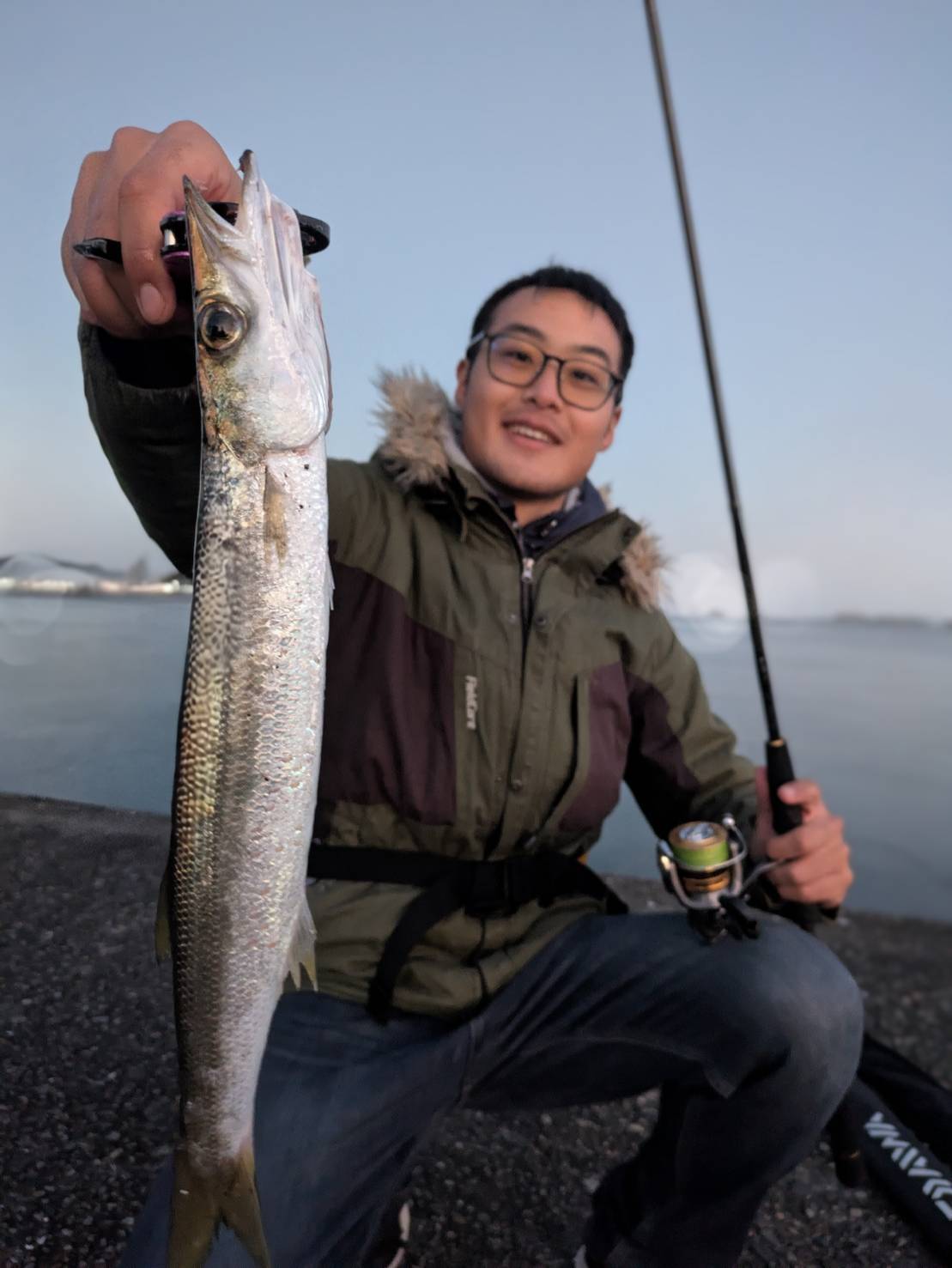 私たちも回遊のタイミングを見極めてルアーを投入すると40センチほどのデカカマスをゲット!ヒットルアーは私がジョルティ22g、原田はレンジマスタ70SWでした!