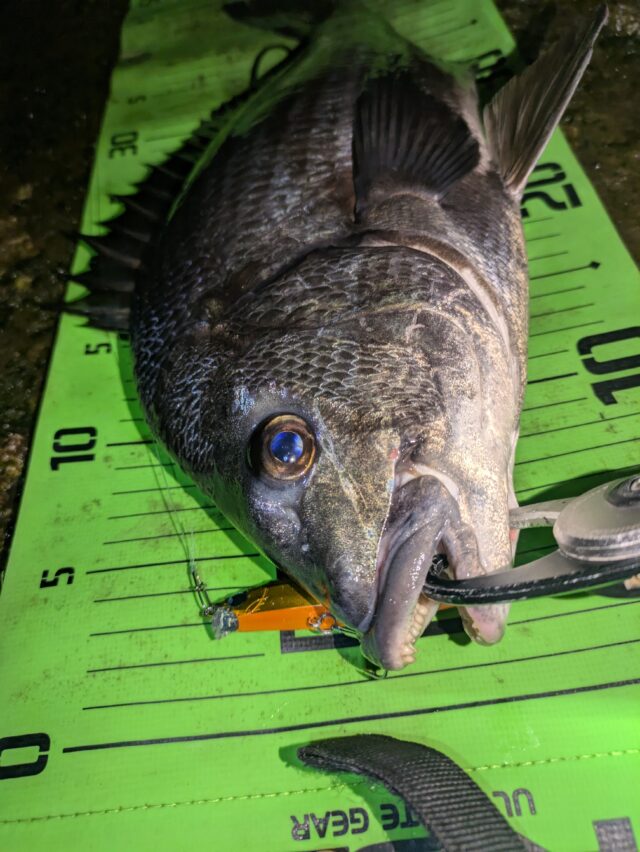 シーバス釣行へ行ってきました。潮は長潮ですが夜は潮が動くので2時間ほどの釣行です。ポイントへ着くと爆風!とりあえずフローティングミノーを流すものの川の流れと風が重なってかなりラインを持っていかれます。また、ベイトが時折ピチャピチャしていますが、薄く、反応も芳しくないのでとりあえず、ボトムへ変更します。シンキングペンシルでDUOのシーク85→シーク85HWとやっていくもやっぱりボトムを引っ張ってこれる時間が短いので、リップ付きシンキングペンシル!バンク82Sヘビーへ。リップが付いている分やはり水をしっかり噛んでやりやすく感じます。ふと風がやんだ時間があり、ボトムにあった瞬間フワッとルアーを外すモーションをした所でゴンっ。あれ?エラ洗いしない…。と思って巻いてくるとチヌ!ここ最近チヌ率高いです…。そのあとボトムを同じようにやってるとセイゴが…。途中までボトムのゴミだと思って巻いてましたが上げた所でポロリ。その後雨が降ってきたので納竿しました。んー!シーバス釣りたい!また改めて釣行してきます。