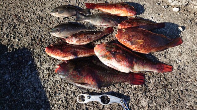 上がったのは 大エスキ、早い時間から小型の尾長グレが釣れ、サイズアップを狙いますが状況は変わらず。タイドプールに海藻を発見! エサにするとイガミ連発(笑) しっかり引き味を味わう事ができました(リリース多数)。重くよく引くのでイガミ釣りも面白いですよ。ホンダワラが手に入らなくでも、海藻が有れば釣れますので是非チャレンジしてみて下さい。今回使用した海藻は写真の黒くてモフモフした海藻です!