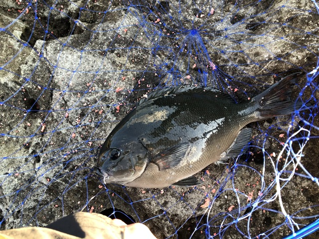 沖向きは波が被りそうな感じだったので、陸向きで開始!!左右からくるサラシがぶつかる所で、ウキが沈む(T ^ T)うまく流れにのせれた時、当たりがありましたが針はずれ(T ^ T)同行者は沖向きで波を被りながらも1投目から当たりがあり、2投目で41センチの尾長が釣れました(^ ^)昼まで頑張るも風も出てきて波が高くなって怖さを感じたので磯替えをお願いしました。