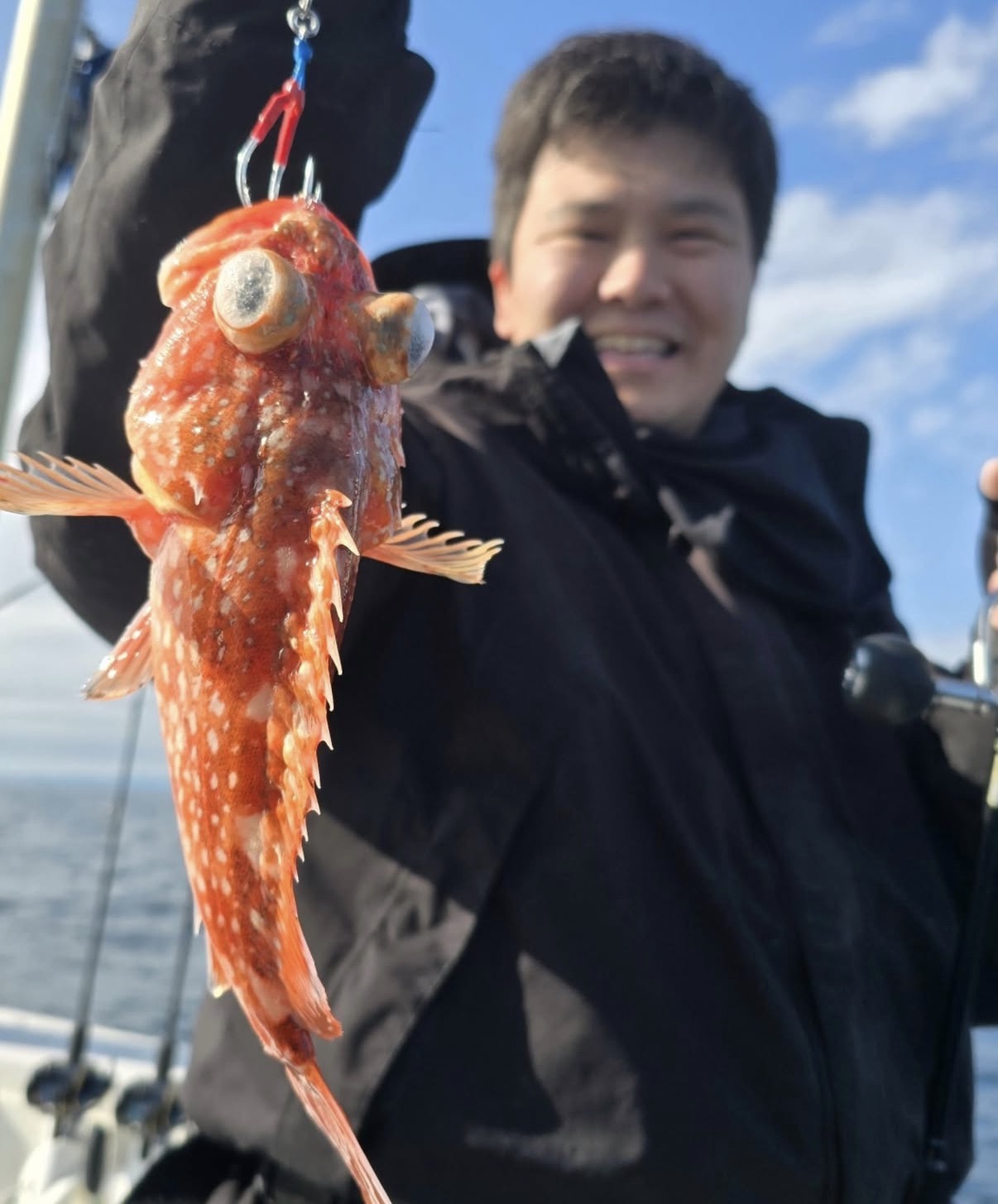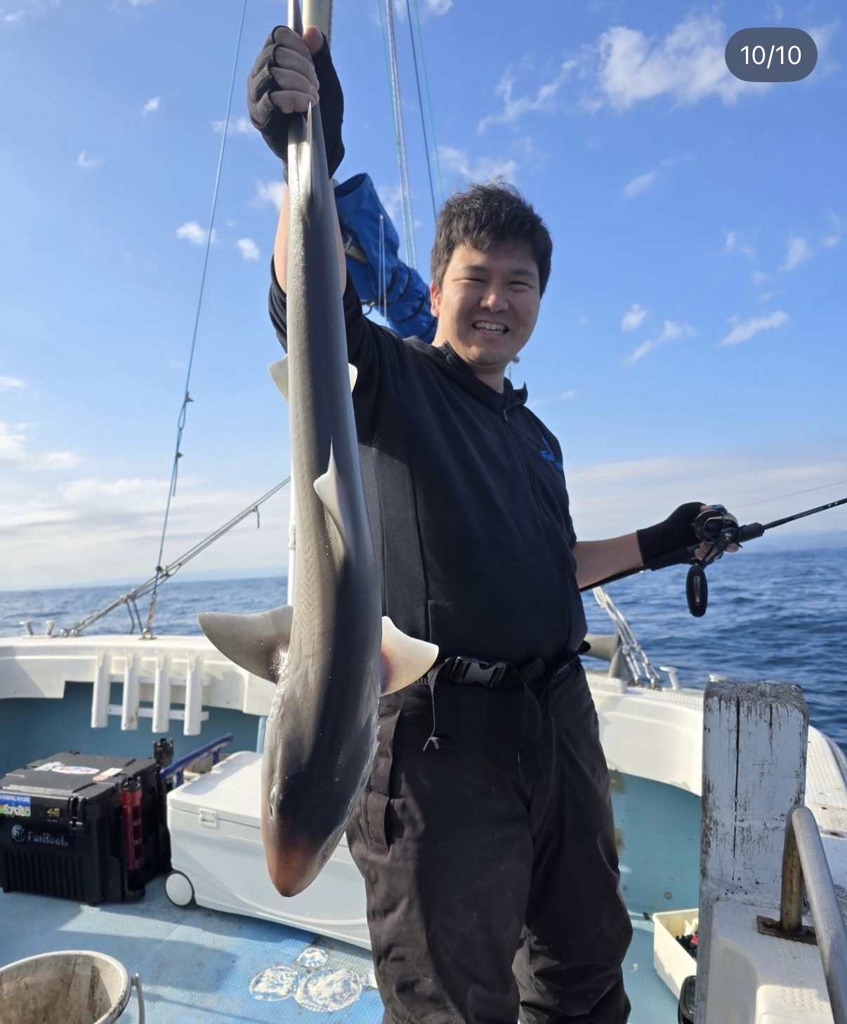 水深100前後のポイントへ移動します。船があまり流れなくなったので、ジグのウェイトを変更し、ウロコジグショート150gのレッドゴールドグローベリーで同じように誘っていると、うっかりカサゴがヒット!根魚が釣れたのでベイトタックルに変えFKジグ180gのPHグリーンゴールドで底付近をネチネチ探っていると、今までとは違う重量感と引き!マハタ来たか!?と思いながら慎重にやり取りするとサメでした…