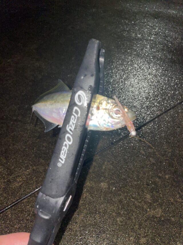 ジグヘッドは0.8g、ワームはセッティングされていたキメラベイト。干潮で浅いのでキャストしたらゆっくりただ巻き。風で吹けているラインが一気に張ったらフッキング!