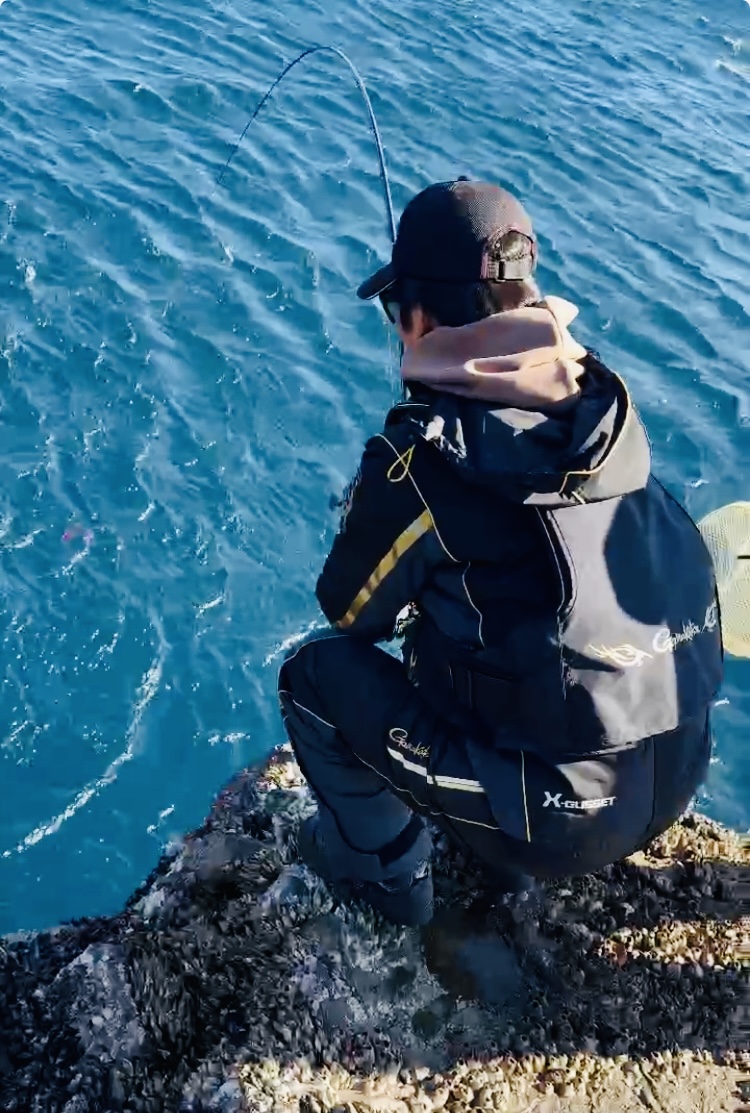 強烈な引きと磯際のしつこい粘りを何とか交わしドラマフィッシュな42㎝の尾長グレをタモ入れ成功‼︎