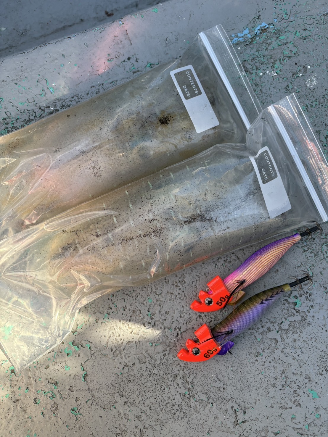 後半戦、ボトムから10回程度しゃくって止めるとすぐに穂先が入りヒット!こちらも800g前後のアオリイカ!ヒットエギはもちろんティップランナー3.5号!カラーはピンクパープルゴールドでした!