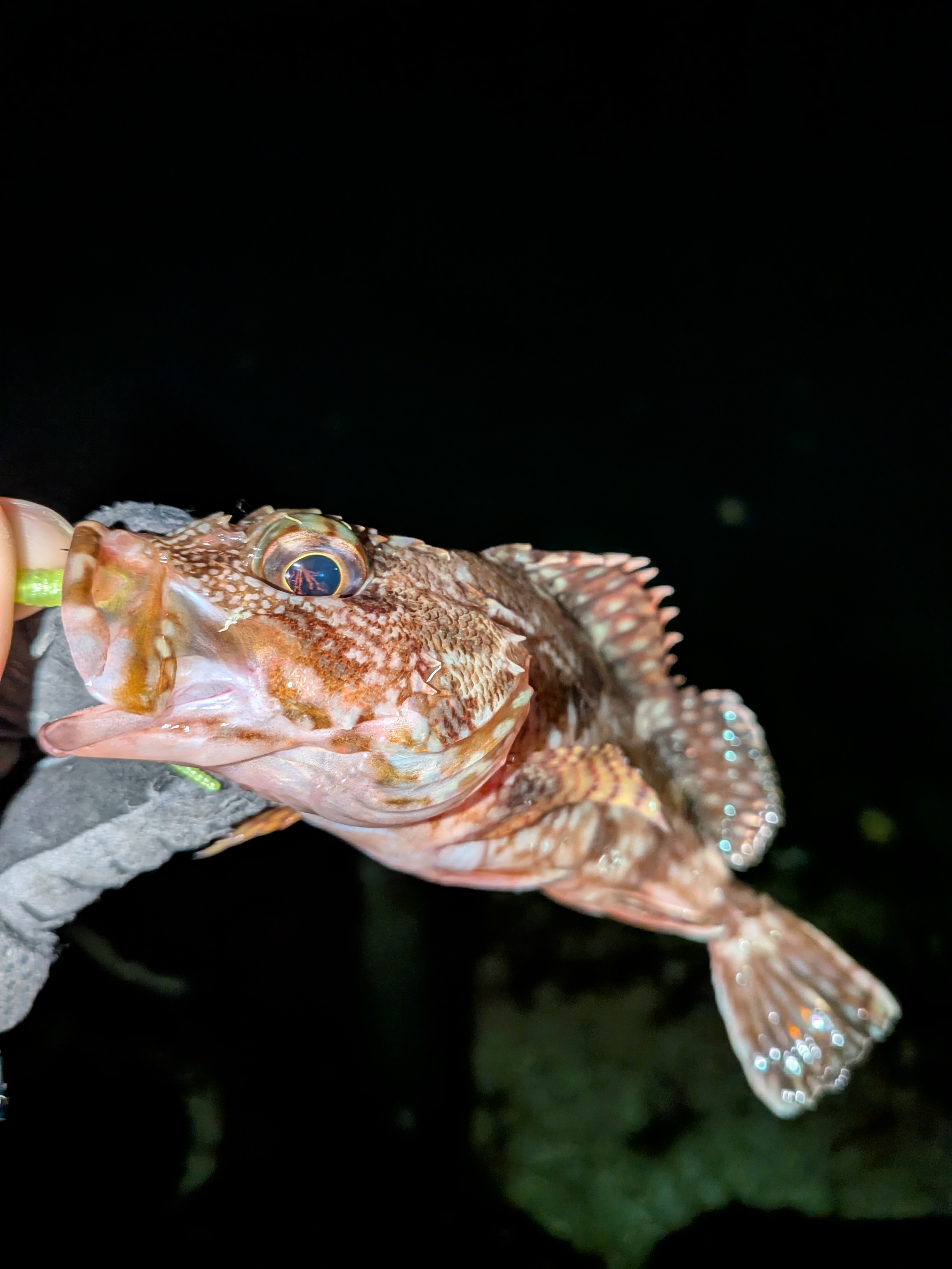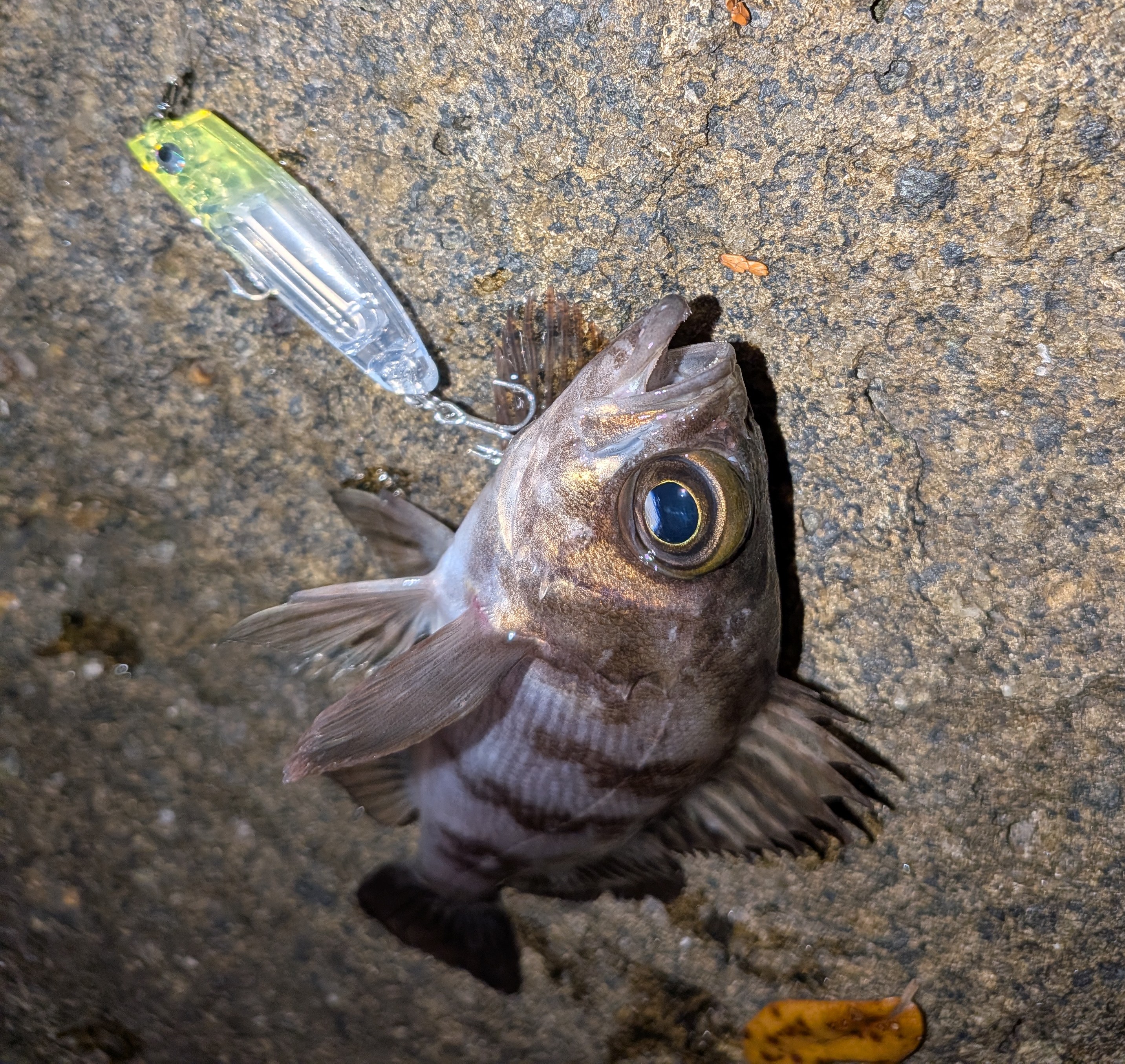ボートからメバルを釣って楽しかったので次はショアから!ということで、仕事終わりに三重南部方面ゴロタ磯へ向かいました!風は強いですが、風裏になりそうな所へエントリー!干潮で足場はしっかり干上がっていたのでスパイクシューズを履いて滑らないようにしていきました。風裏になっていることもあり水面は水鏡状態だったので最初はスミス様のメバペンからキャスト。2キャストして反応なければ直ぐに別の角度からキャスト。というふうにしていき、バイトがあったものの乗らず。ルアーを少し水の中に入るオルガリップレスへ変更!ワンキャスト目で直ぐにヒット。小さいですが今年初めてのメバル!その後もオルガリップレスがぴったりだったようで数匹釣りました。最後に澪示威ソリッドを投げてみてコンっというアタリのみ…。じゃあワームは?ということでヤリエ様のメバリー早掛けにアジキャロスワンプでボトムをやるとカサゴと小メバルでした。因みにですが水深はヒットしていた所は1メートル未満でヒザくらいの水深への駆け上がりで喰っていました。浅い所はやっぱりメバル多いです。ジグヘッドワームよりもプラグの方が根掛かり少なくてオススメです!是非挑戦してみてはいかがでしょうか?