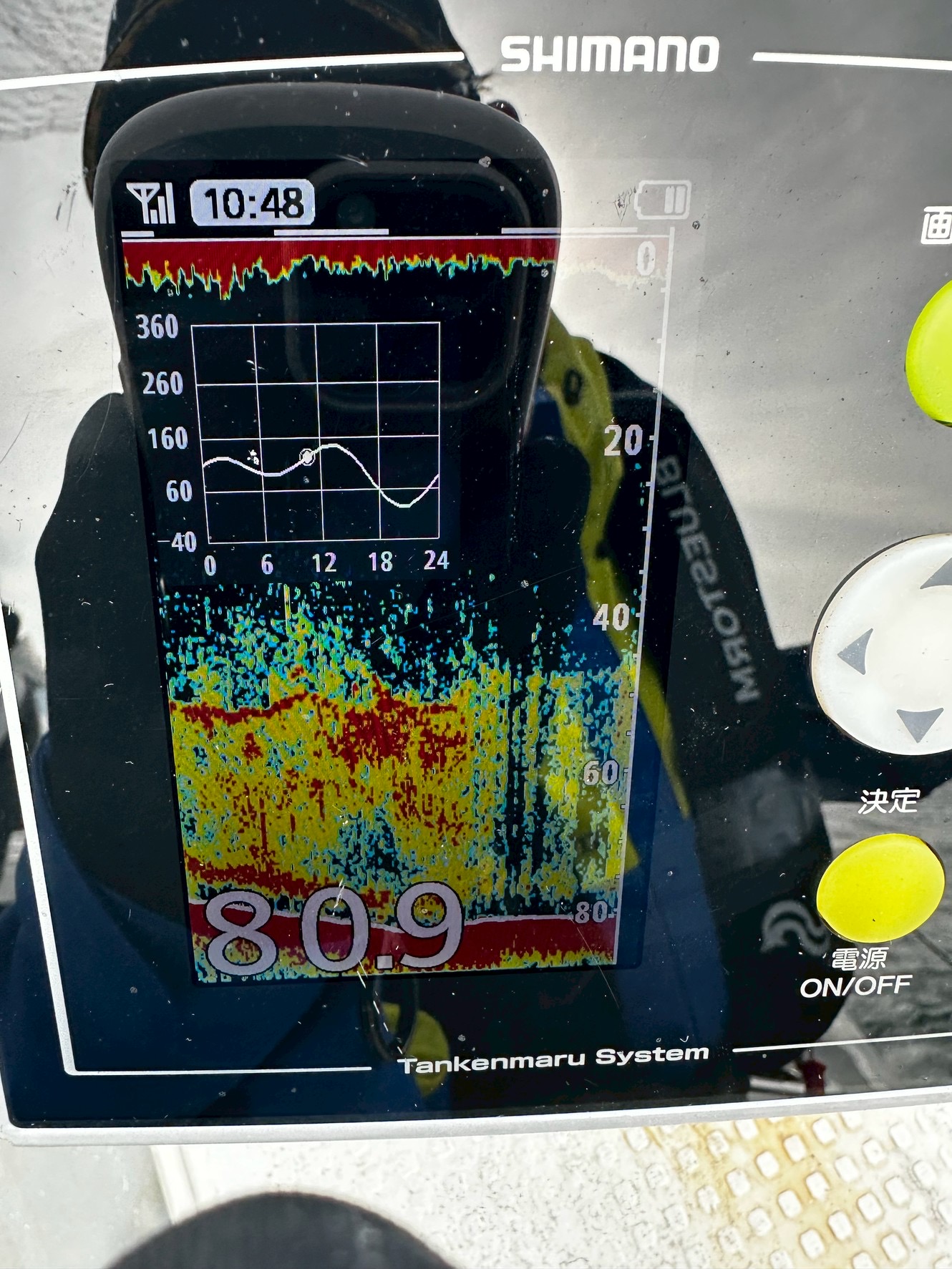 それでも頑張ってシャクっていると船中でヒット!嬉しいゲストのヒラメ!さらに上げ潮の緩くなって来たタイミングにジアイがあり探検丸のベイト反応の写り方もバリバリとなり周りの船でもタモ入れしている!船中でついに青物ヒット!値千金のワラサゲットされていました!