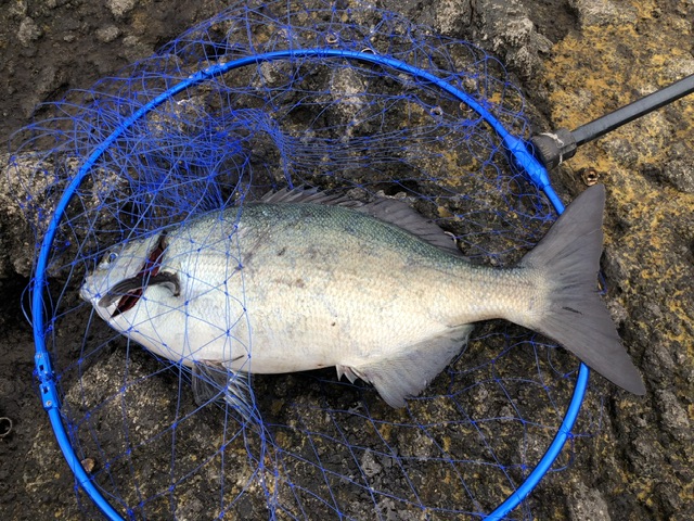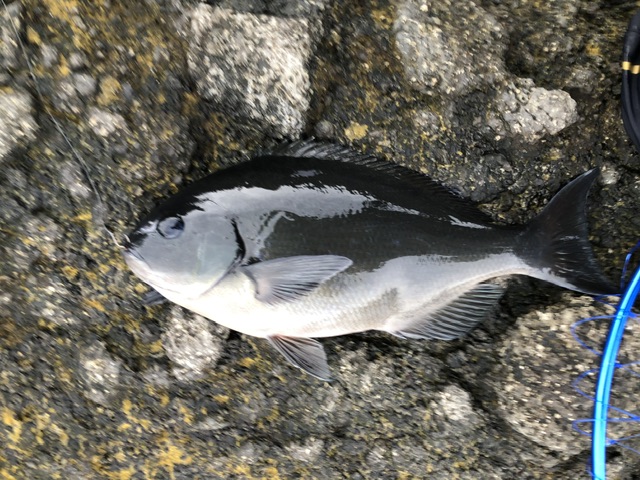 餌を撒いても魚の姿は見えなくて、2ヒロでスタートしましたが餌も触られてないので半ヒロ深くし、ガン玉を打ち深く仕掛けを入れてくとバチバチと当たりがあり37センチの尾長グレが釣れました\(^^)/その後も当たりはあるけど、2回バラし(T ^ T)終盤で35センチ程の尾長グレを2匹と、タモ枠いっぱいの太いイスズミを1匹追加して終了でした!!