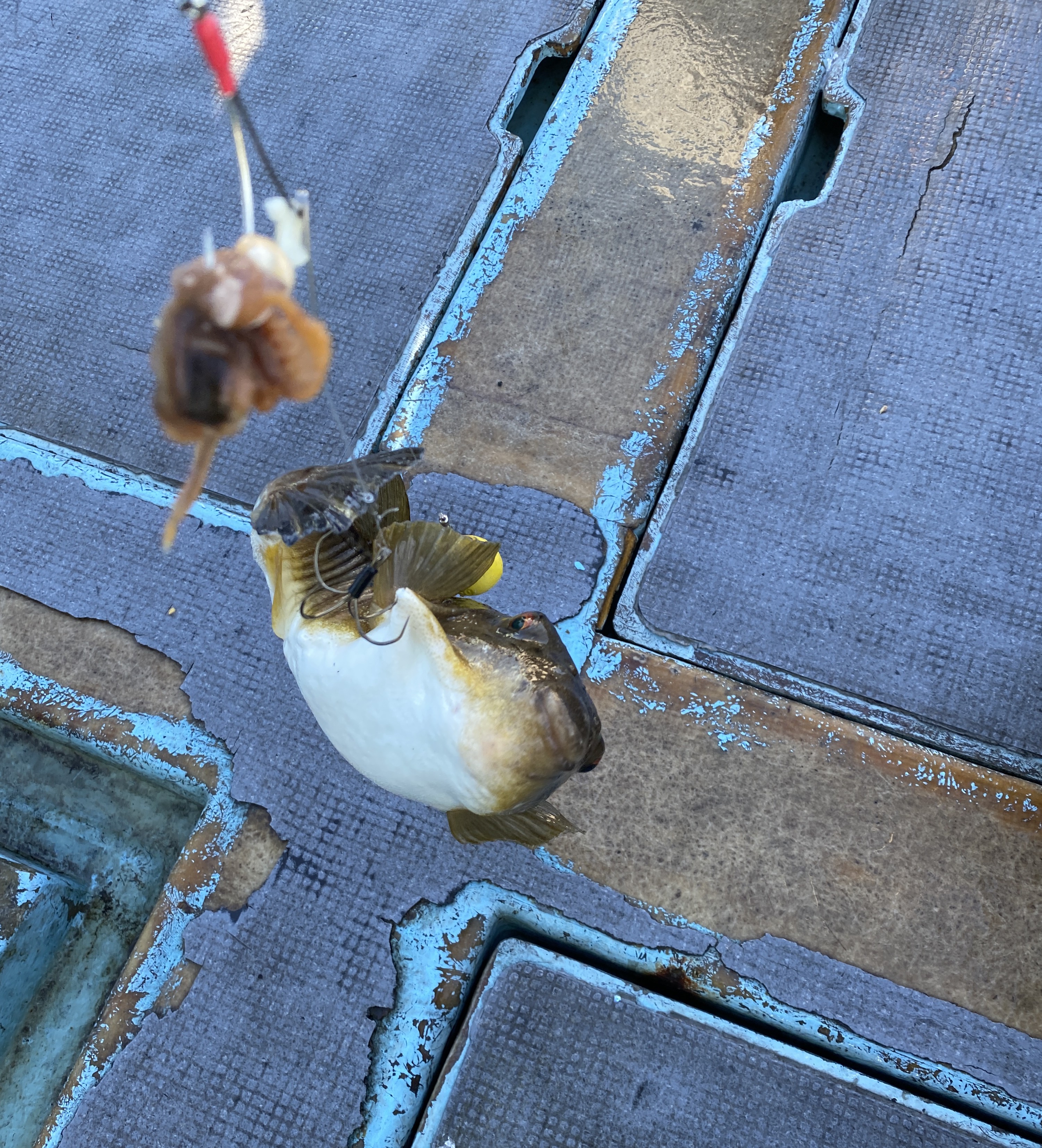 2026年の初釣りへ行ってきました!日間賀島周りを案内してくれる片名港出船の甚栄丸さんにお世話になりました。当日は風速10m予報!防寒対策バッチリにして、いざ出船!狙うは巨大ヒガンフグ!日間賀島へ向かうまででも強風状態の中、少し風裏からスタート。水深は浅く、岩礁エリア。まずはヤマワのシングルアームから開始。根がかりしないように攻めていきます。すると同船者に早速ヒット!コモンフグでした。すると自分にもコモンフグが!小型が多い中、ヒガンフグもちらほら混じり始めます。自分にも良型ヒガンフグゲット!一安心し、ポイントを移動しながら釣りますが、いかんせん風とウネリで仕掛けが安定しません・・・仕方なく、風裏ポイントへ。やはり根がかりが多いので、吹き流しよりも捨てオモリ式の方が使いやすかったです。ここでも数匹ヒガンを追加し、ラストはカサゴのお土産を釣って納竿となりました。今回も、アオヤギとアカガイをメインで使いましたが、アカガイでもちゃんと釣れましたよ!これから巨大ヒガンフグがメインとなってくるはずなので、皆さんも是非!!