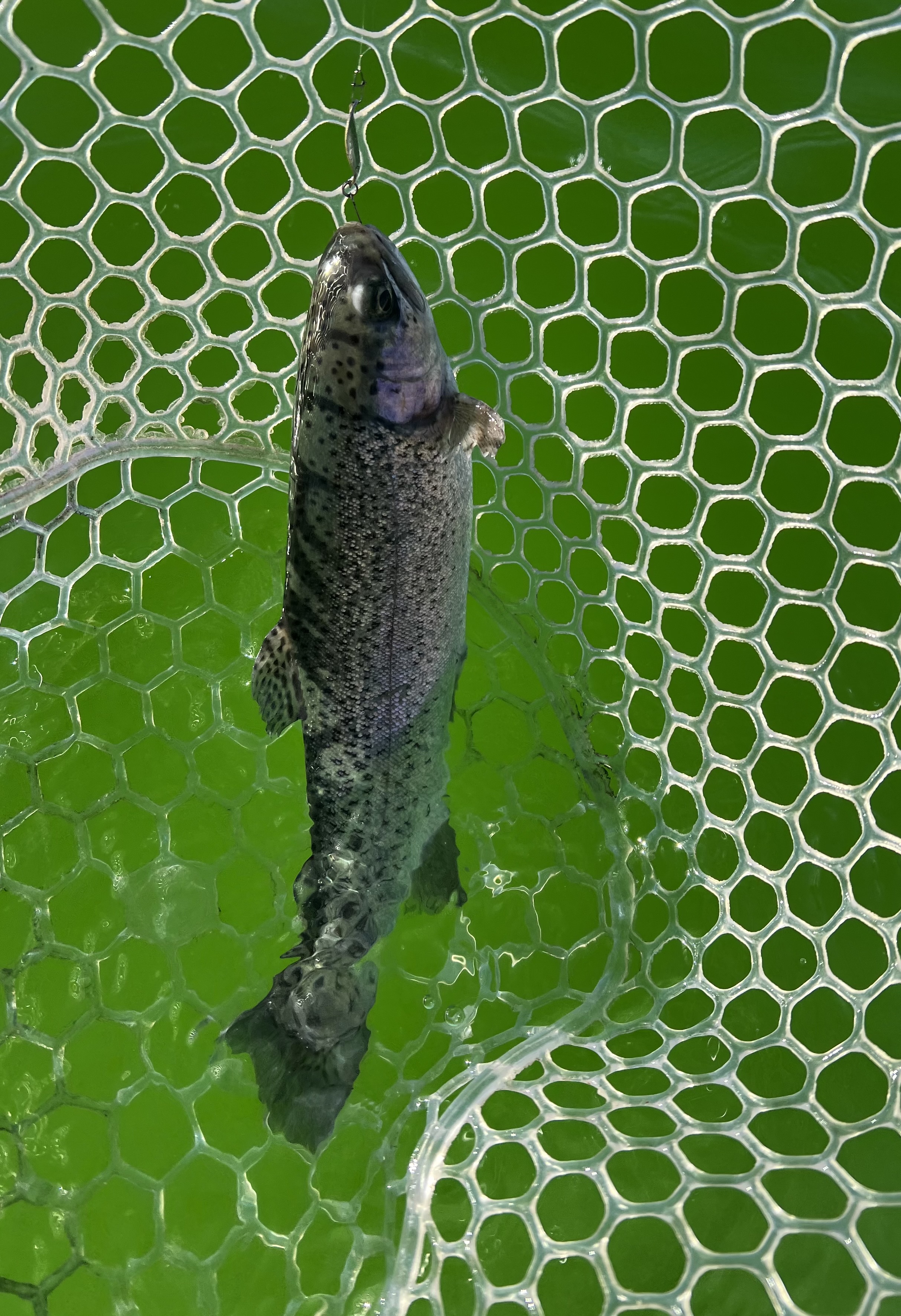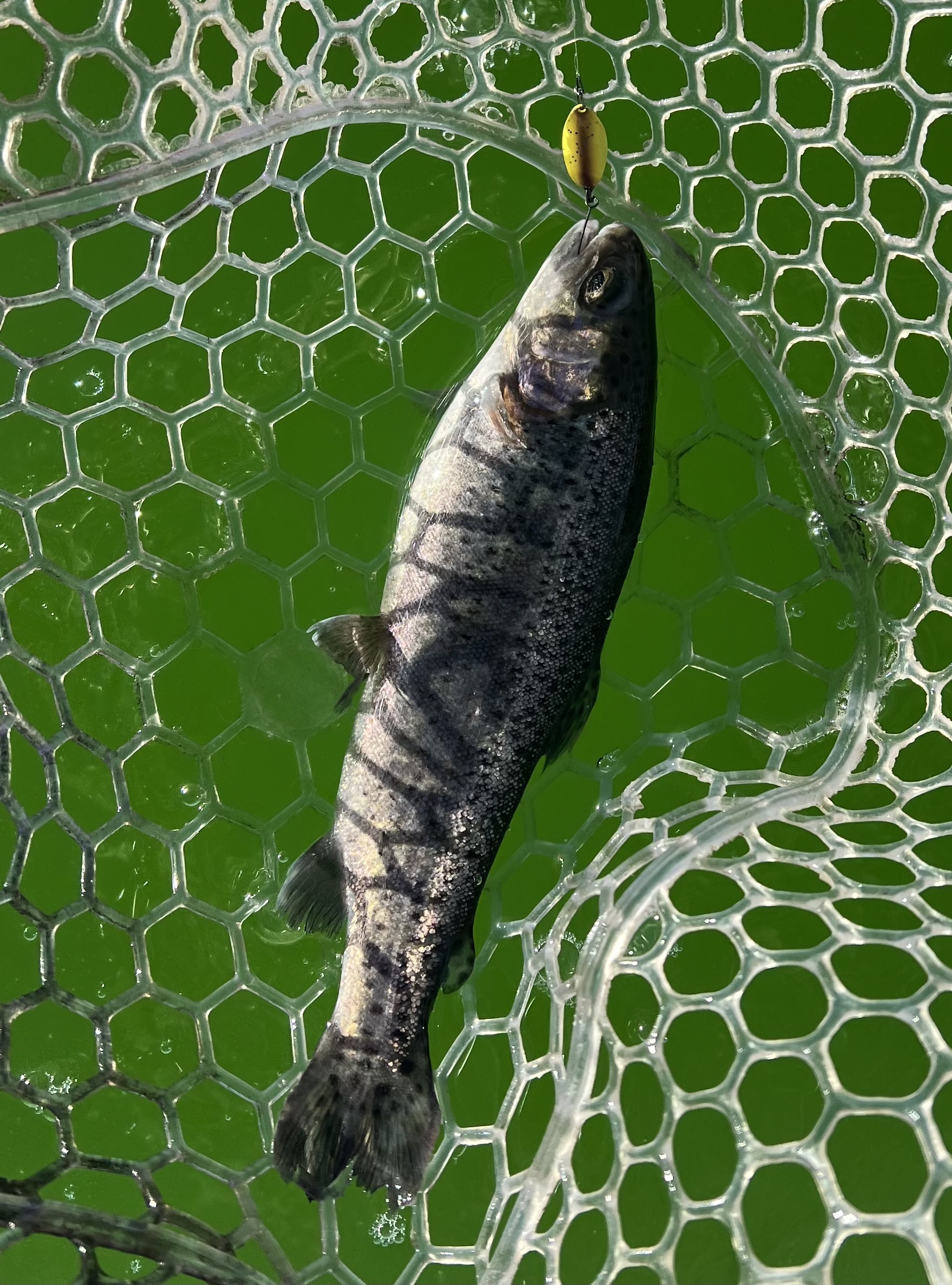 この日は久々に日進プール様にお邪魔してきました。昼からのスタートで序盤はパターンをつかめず苦戦。1時間ほど立ってなぶらや様のアキュラシー0.9gをゆっくり巻いているとヒット!これがパターンにハマったらしくアキュラシーをカラーチェンジして連発!特に悶絶ホワイトや白の明滅での反応が良く、ひたすらゆっくりと巻いてくるとヒットてしてくれますよ!その他にもノアの0.9gも軽くタップすると釣れ、こちらも白やピンク系に反応が良かったです。後半は活性が上がり、かなり簡単に釣れるようになっていましたよ!プラグの反応はあまり良くなかったですが、スプーンの反応はかなり良かったのでオススメ!ぜひ行ってみてください!