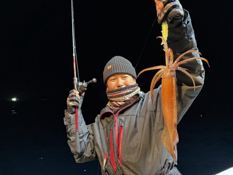 初めてなので、ティップランに近いとの事なので、やって見る明るい内は掛からなかったが日が沈み暗くなって来ると掛かり出した。ヤリイカに始まりアカイカ、スルメイカと掛かり出す。